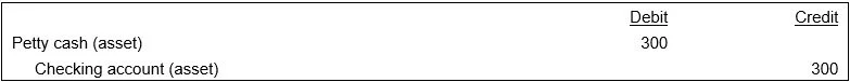 The second step is to deposit cash into the petty cash account, probably by writing a check to the account from the corporate checking account. A typical petty cash account balance is $300; such a payment would result in a debit for $300 to the petty cash account. A sample journal entry that shows this transaction appears next.