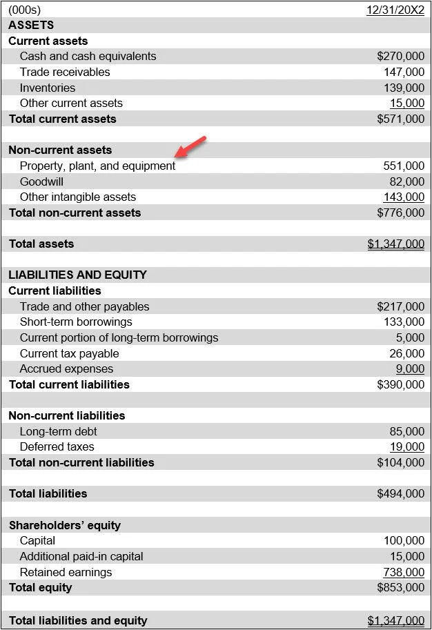 The property, plant, and equipment asset line item is stated in the balance sheet as a non-current asset, and is typically offset by an accumulated depreciation line item. The accumulated depreciation is a contra account, and reduces the balance in the PP&E line item. A simplified presentation that merges the PP&E total and accumulated deprecation into one line item is highlighted in the following exhibit, which contains a balance sheet.
