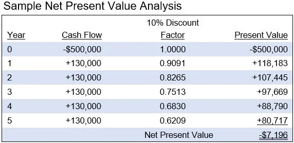 We will continue with the preceding payback example. The cost of capital is 7%, so the present value factor for 7% is included in the payback table, with the following results: