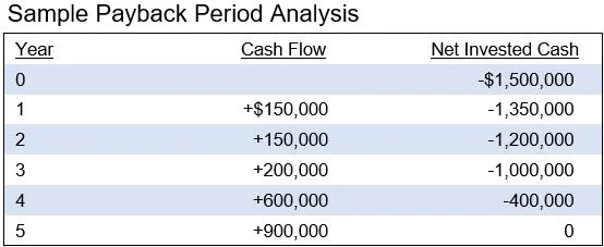 Under the payback approach , determine the period required to generate sufficient cash flow from a project to pay for the initial investment in it. This is essentially a risk measure, for the focus is on the period of time that the investment is at risk of not being returned to the company. This analysis is most useful when used as a supplement to the preceding two analysis methods, rather than as the primary basis for deciding whether to make an investment. A sample payback period analysis appears in the following exhibit, where successive periods of projected cash inflows are deducted from the initial amount of invested cash to determine how long it will take to achieve payback of the initial amount.