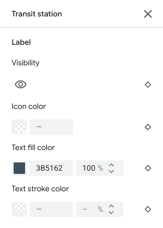 For map feature types that are fully or partially represented with a label, such as Transportation and other non-Point of interest types, you can usually style the following elements: Visibility, Icon color, Text fill color, and Text stroke color.