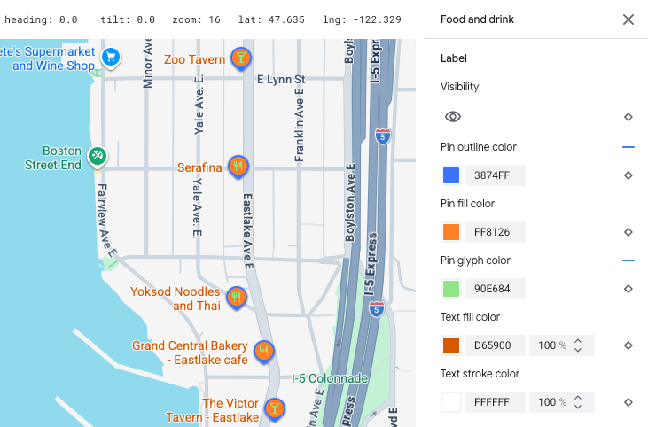 You can customize the visibility, fill color, stroke color and width, icon color, and text fill and stroke color for various map features depending on their type.