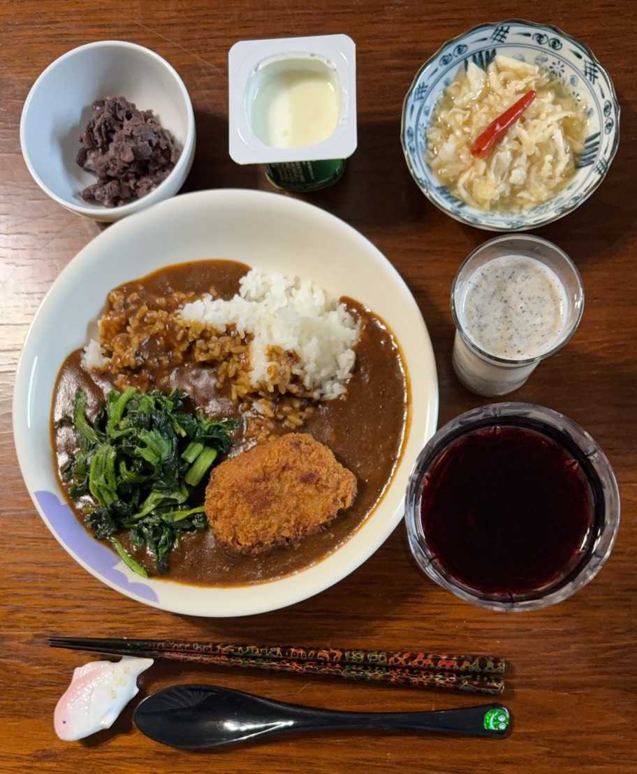 今日の夕食 あきたこまちご飯にレトルトカレーと海老カツとほうれん…