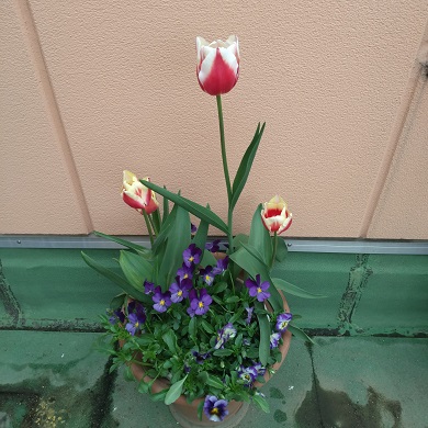 チューリップが傷んできました。花びらは日中はすっかり開いたまま、夕方になると少し、元の形になります。ビオラも伸びてきて、チューリップとのバランスが崩れてきました。思い切ってチューリップをカットしました。その後に葉ボタンを植えました。今年の葉ボタンはチョット変・・・・・どの株もまったく巻くことを忘れたように、伸びて伸びて花が咲きだしました。2球だけのチューリップは、やはりどこから来たのかいまだに謎のまま暑すぎたから? まったく葉ボタンに見えません。植え方の工夫をしてみました。(一番美しいコラボのつもり)真上から撮ってみました。鉢はできるだけ平鉢を使ってみました。(咲き始めの頃のチューリップとビオラ)日本ブログ村ランキング参加中です。にほんブログ村 いつもご訪問いただきありがとうございます。