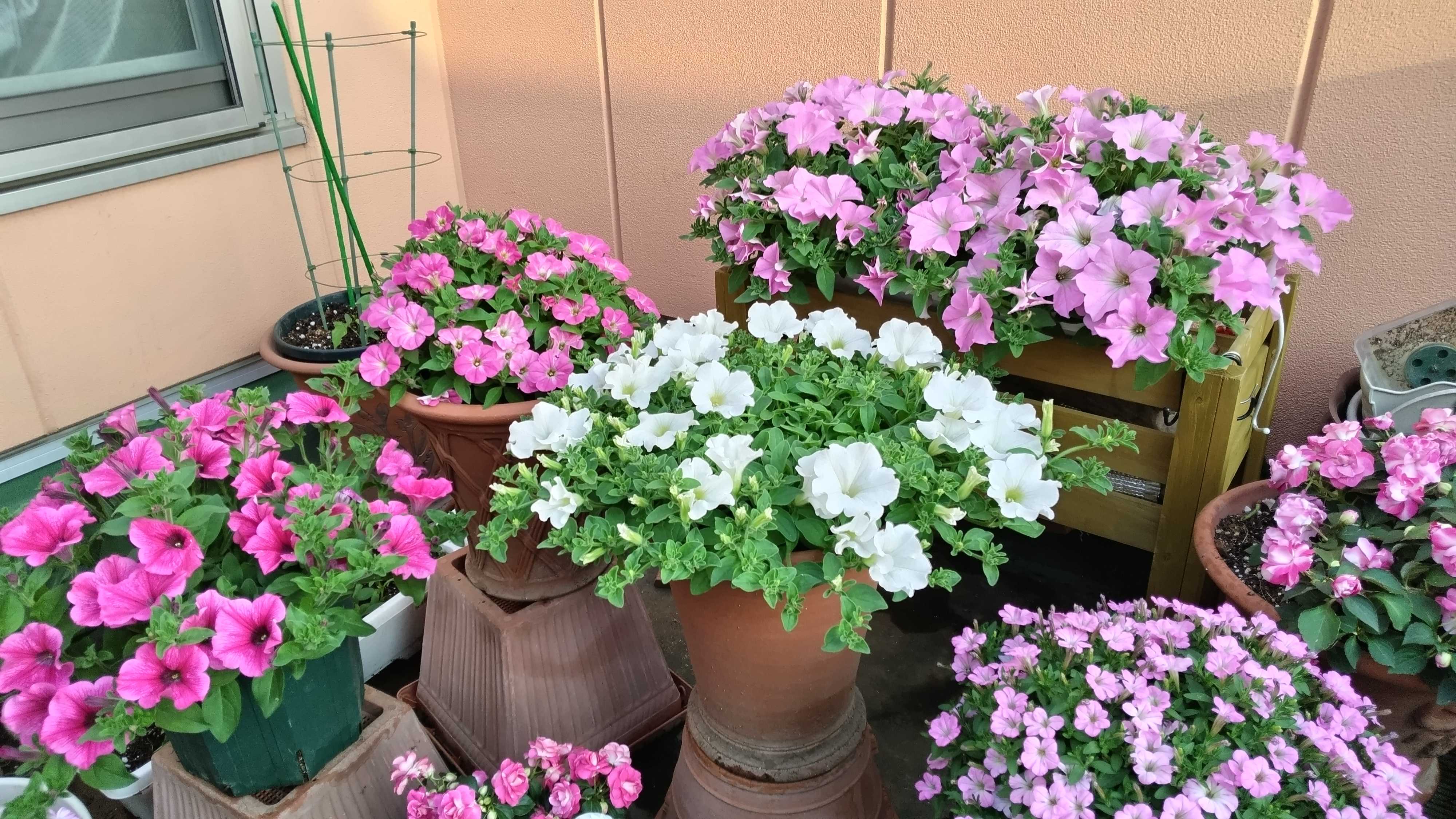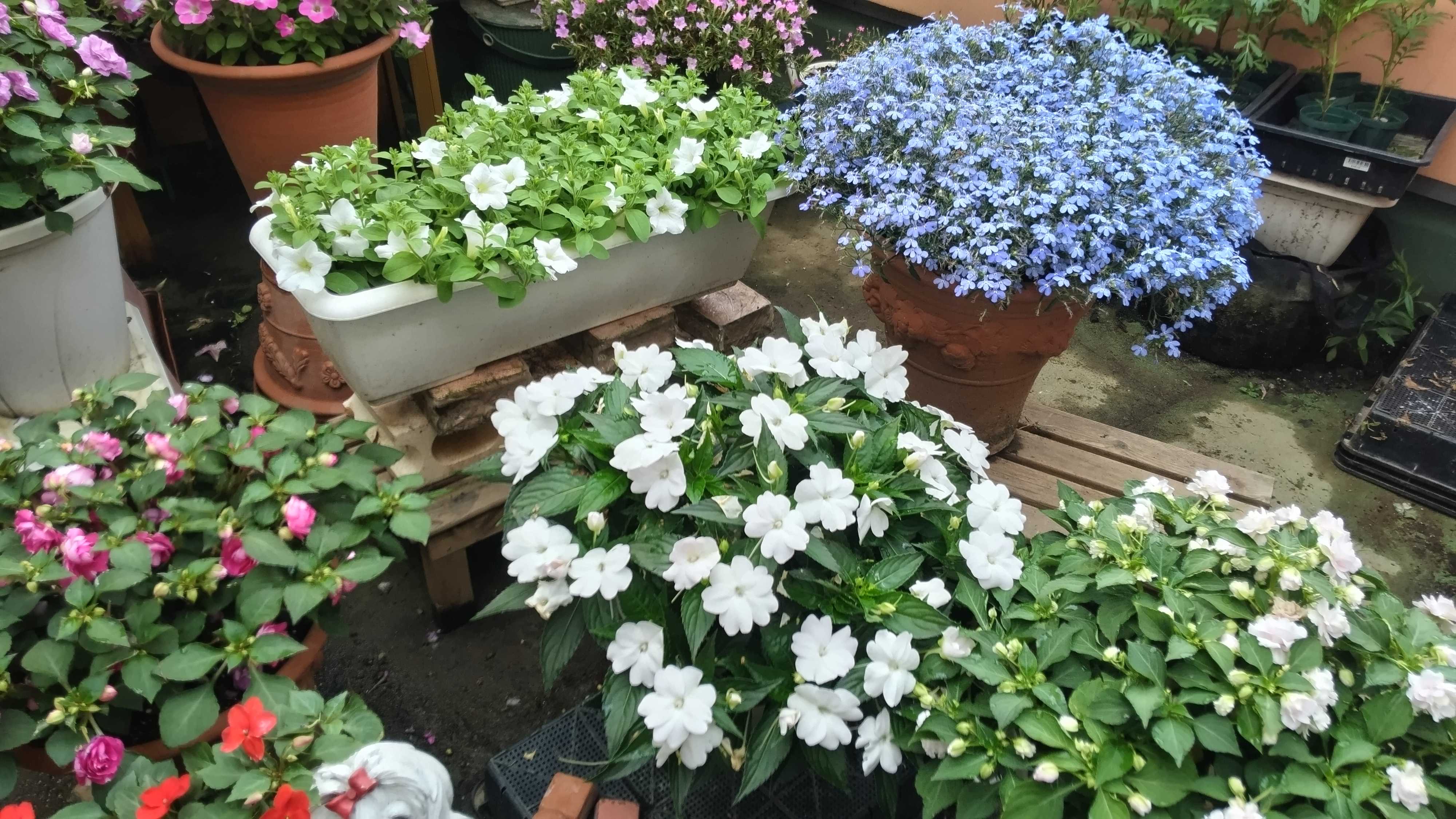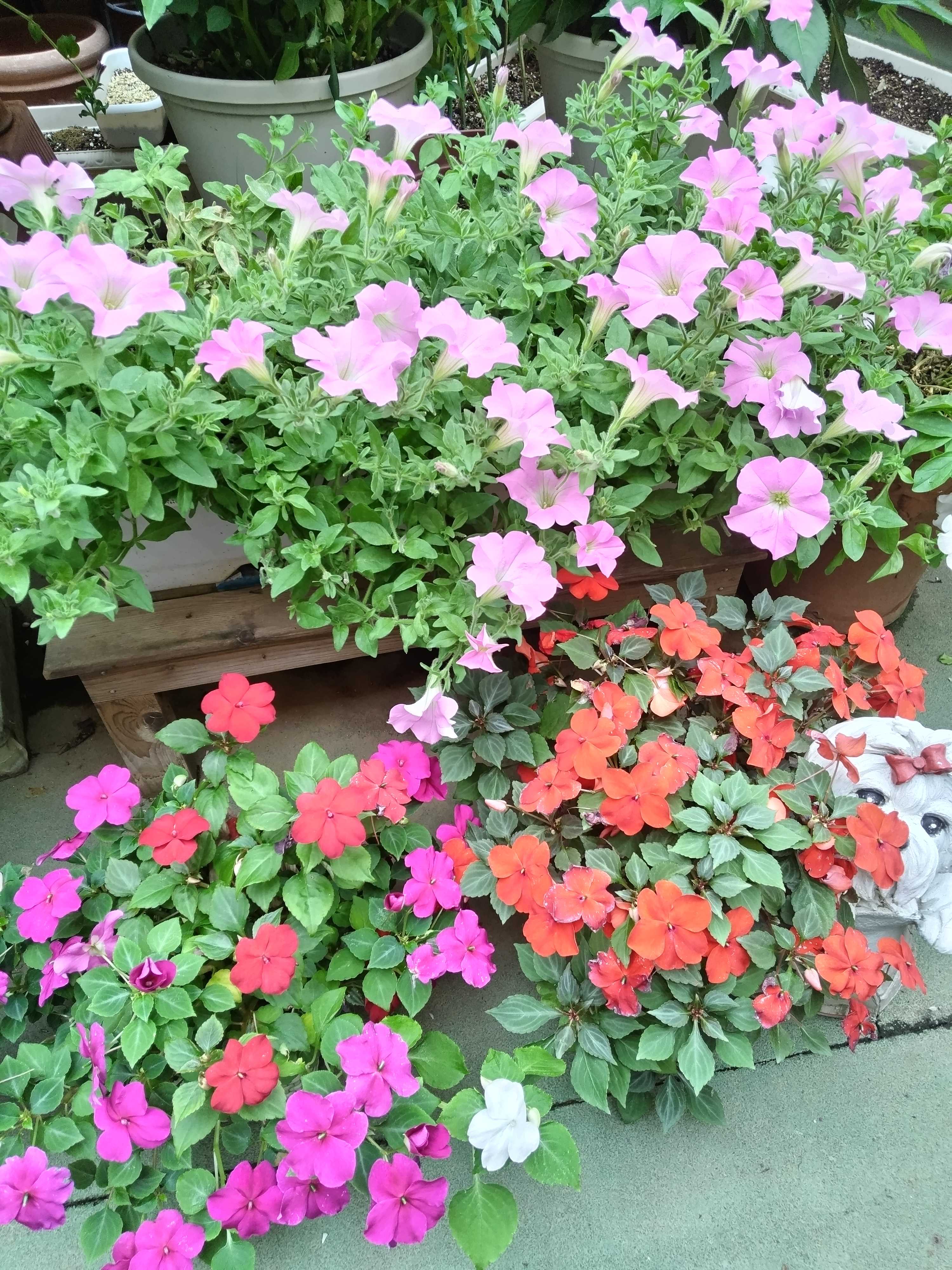 今年は天気が安定しないので、花たちの成長も良くありません。漸く、サフイニアのレッドパステルピンク、ダブルインパチェンスなどが咲いてきました。パステルピンクの葉が伸びて2株が間もなく合体ですね。賑やかなお花が咲くだろと思います。毎年、何十年も植えてきたピンクラッフルが売られていません。もう少し探してみたいですが、ダメでしょうか??ダブルインパチェンスの「アップルブロッサム」中心はもっとピンクになって綺麗なのですが。いつもとちょっと違います。今迄育てたことのないお花の色目です。日本ブログ村ランキング参加中です。にほんブログ村 いつもご訪問いただきありがとうございます。