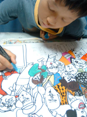KAIの方は着々です。というのも、このヘナチョコザムライには鬼の「お目付役」がついているから。KAIは描く時には「もういいよ、このぐらいにしといて」というぐらいにドワーッと描くのだけれど、ムラがありすぎるのが難点。時間的なことやスペースについてもあまり実感がないというか、その辺りのやりくりは、やはり私が口出ししちゃうわけですよ(笑)。ここの壁面用のを先に仕上げちゃおうとか、この前の塗りかけの早く仕上げろとか。