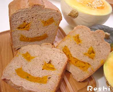 パンをカットしてびっくり、かぼちゃのおばけがうひょ~~~。