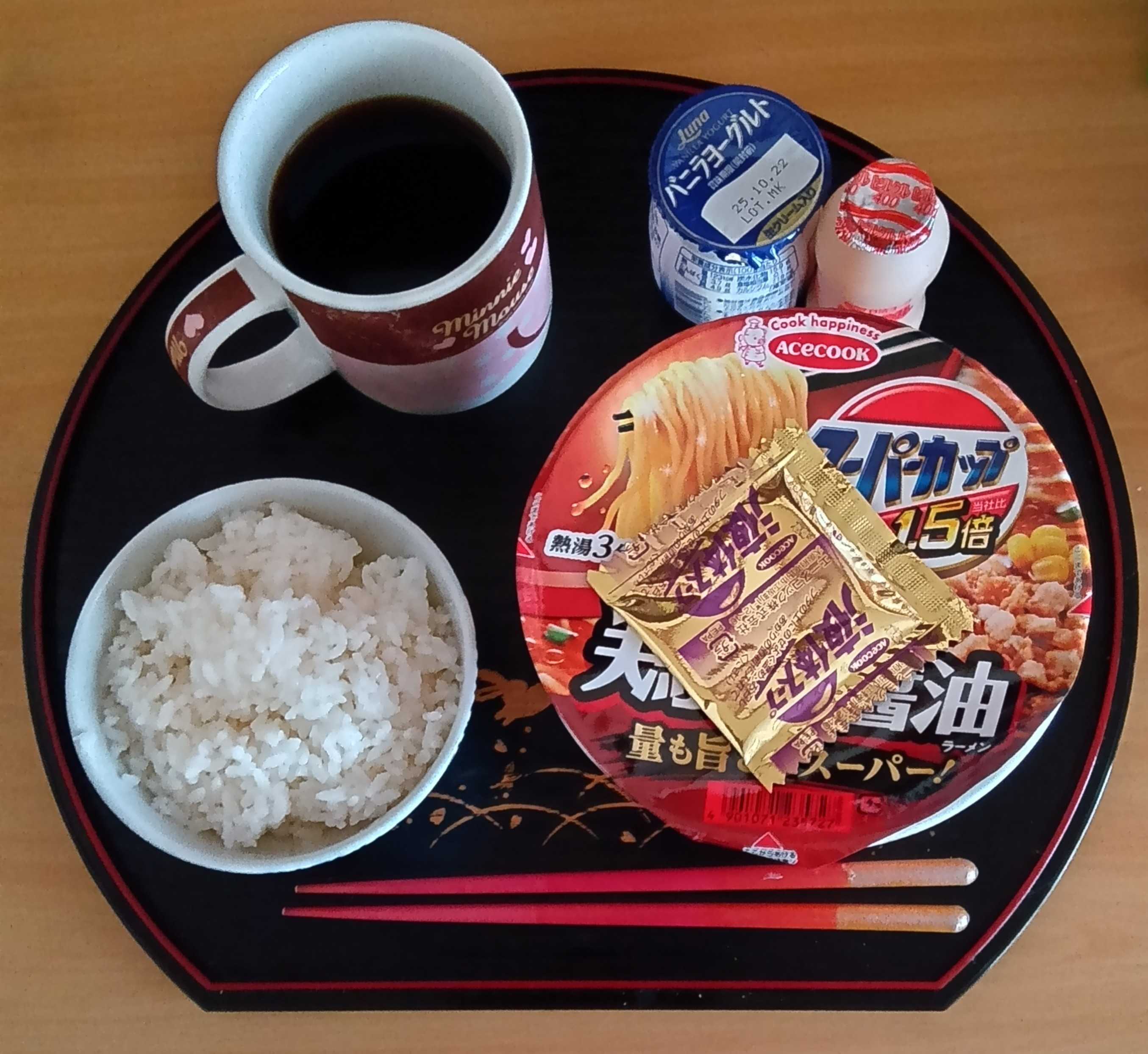 日曜日の朝ご飯はカップラーメンとご飯。