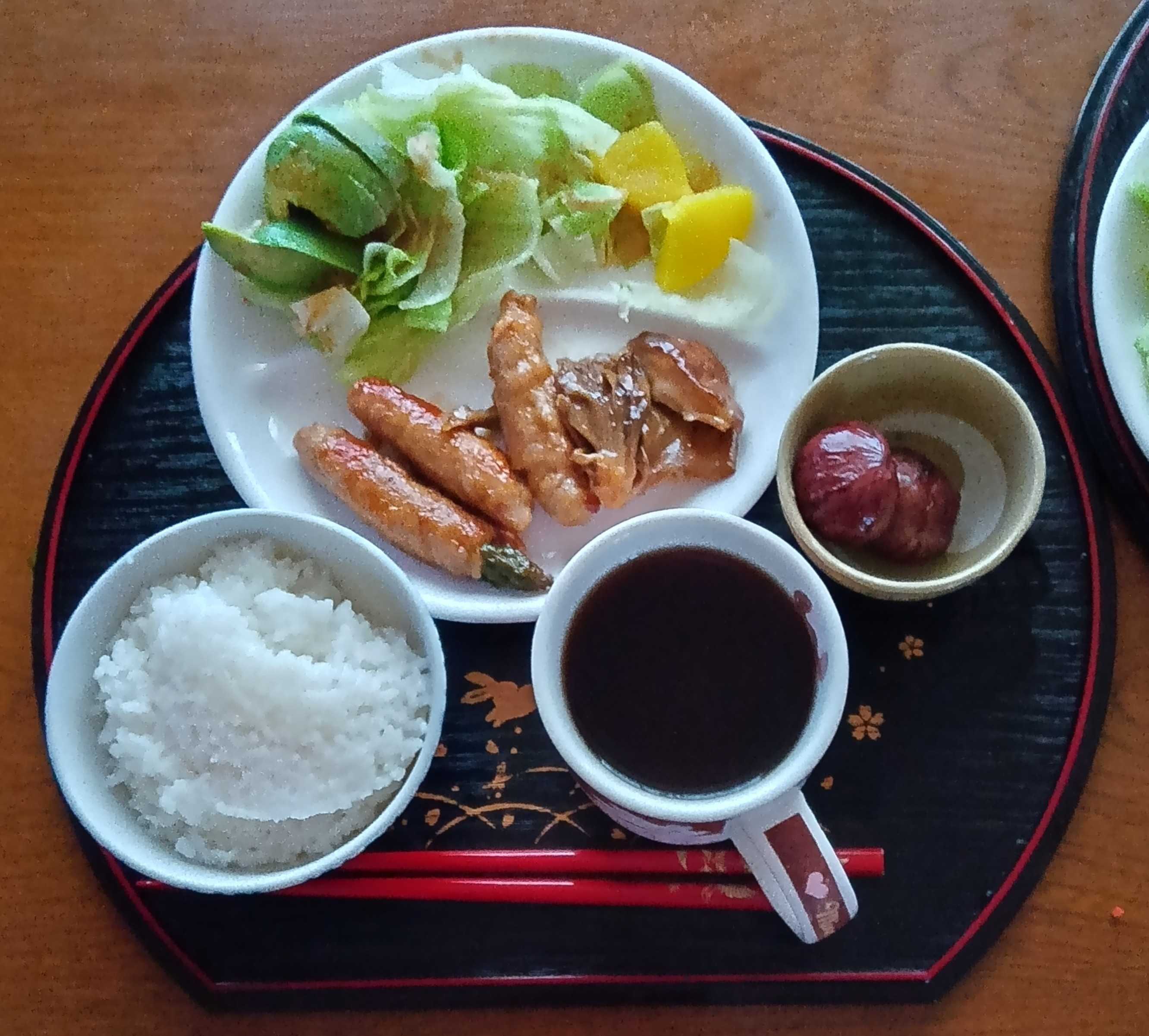 昼ご飯は13時半 アスパラ肉巻きと渋皮煮