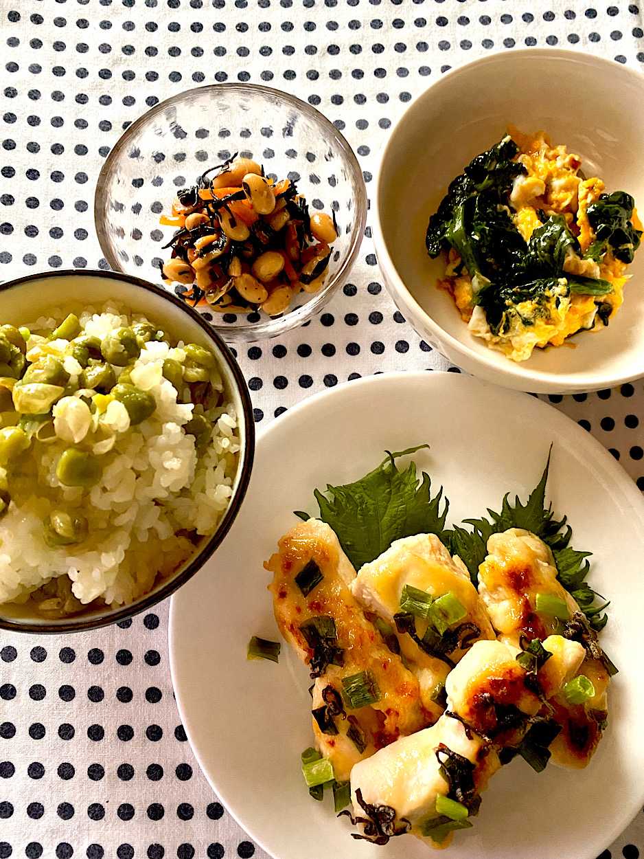 豆菓子で豆ごはん、人参サラダ
