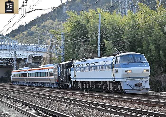 EF66-125 9866レ 385系甲種輸送 2026.01.29(木) 山崎ー長岡京 佃踏切NikonZ9 Z24-120mm/f4前日同様に直前に晴れて逆光沈没