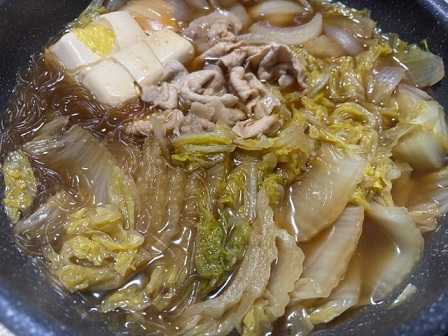 こんにちは~週末で~す何だかんだ後一週間で年末年始休暇ですね。9日間も休めるなんて週明け毎週大根や白菜を頂き、流石に1人では消費出来ないので、弟の会社の人に貰って頂いて(;^ω^)野菜があるだけでも十分食費は助かりますね冷凍庫のストック食材豚肉のロースで、豚すき焼きです(b≧∀)グッド♪ネギ無いので、玉ねぎで代用。焼き豆腐の代わりに普通に豆腐。白滝もマロニーに無いので、ストックの春雨で生卵は高額になっちゃったので、ストックの温泉卵十分すき焼きを堪能出来ました~(´艸`*)ランチに食べてる業者さんのお弁当の総菜も料理の参考になってますね(b≧∀)グッド♪