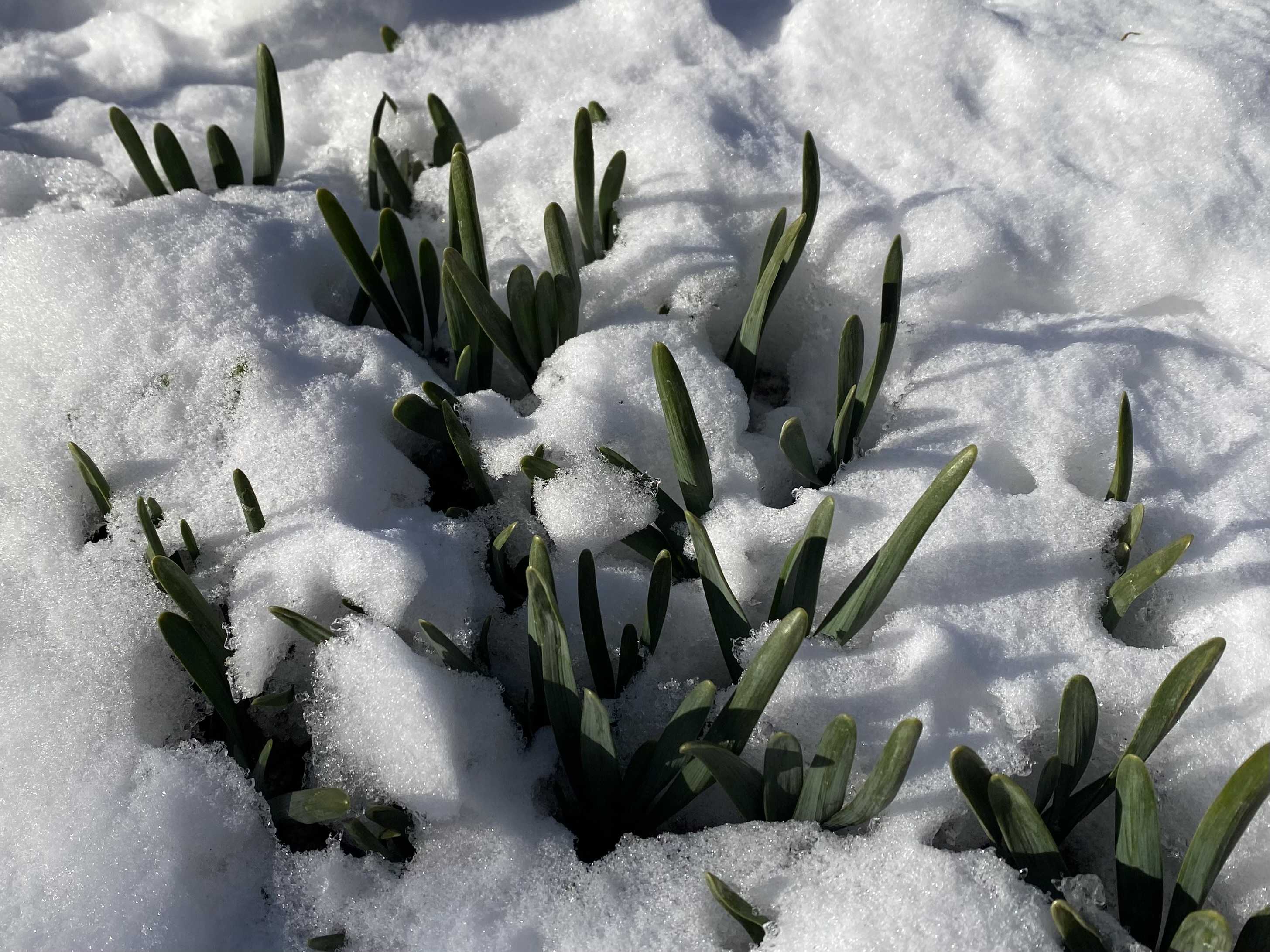 雪の庭の水仙の葉。雪の上に初足跡。