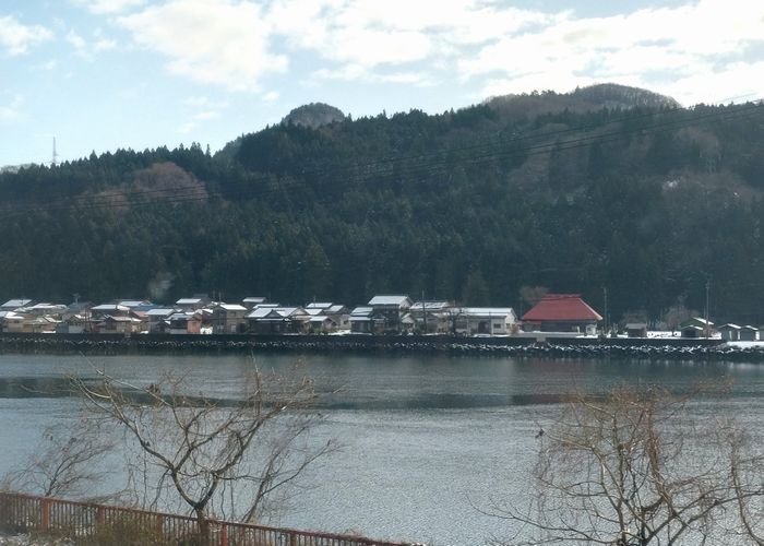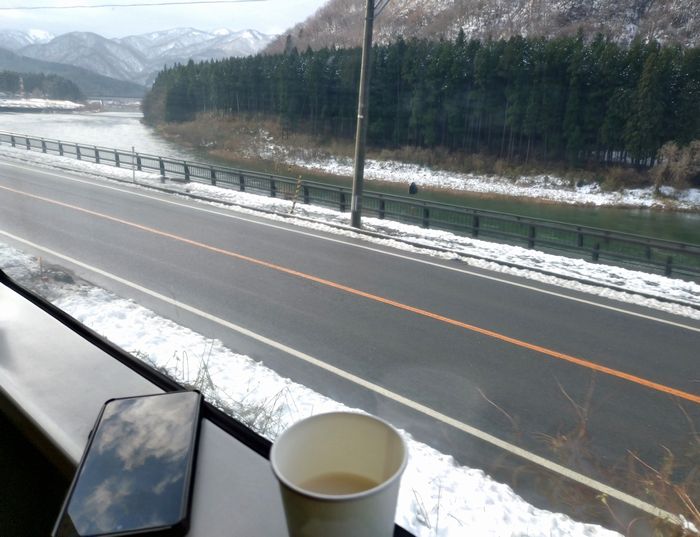 その後無事に会津若松行きの列車に乗り、元来た鉄路を引き返します。阿賀野川沿いに走る磐越西線は雪景色が楽しめ、まさに風光明美。日本酒をちびちび飲みながら、ぼーっとしたりうたた寝したりして、まったりと過ごします。