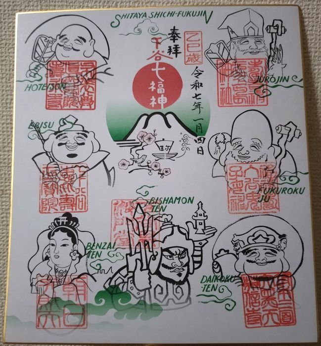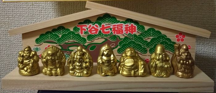 これで下谷七福神めぐりが終了しました。色紙に御朱印がそろい、寿永寺でのみ扱っている絵馬台を購入し、七福神の神像を並べてみました。