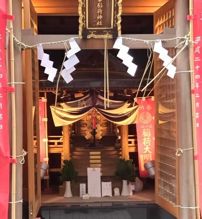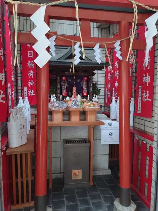 4カ所目に訪れたのは、 朝日稲荷神社 です。本殿(といっても小さなお社です)はビルの屋上にありますが、道路沿いに拝殿があり、本殿に届くようになっています。