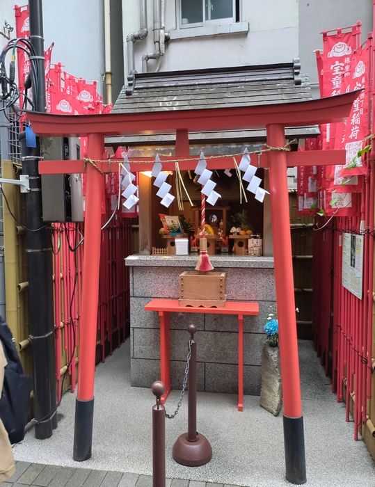 そして最後にお参りしたのは、⑦ 宝童稲荷神社 です。ここも過去に何度か訪問させていただいています。晴海通りを渡り、小さな路地を入ります。入り口は非常に分かりづらいのですが、猿のオブジェが案内してくれています。