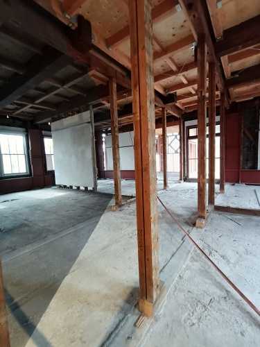 建物中に入ると正面に階段、左右に空間がありますが、壁は取り払われてほぼ柱だけの状態です。2階では映像作品を観ることができました。(写真は撮らず)
