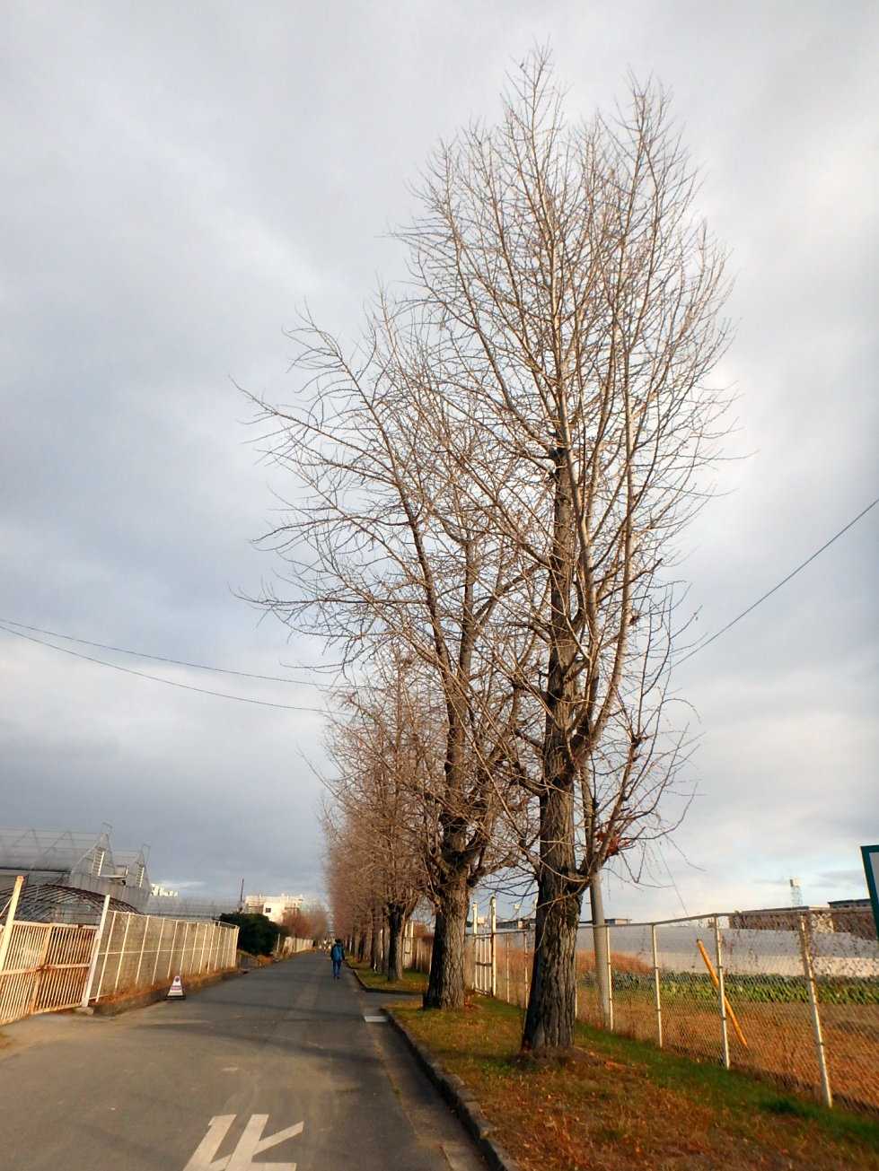 【F:岡大七不思議の1つ『落ちないイチョウ』もすっかり葉を落とす。左側、前から2番目】