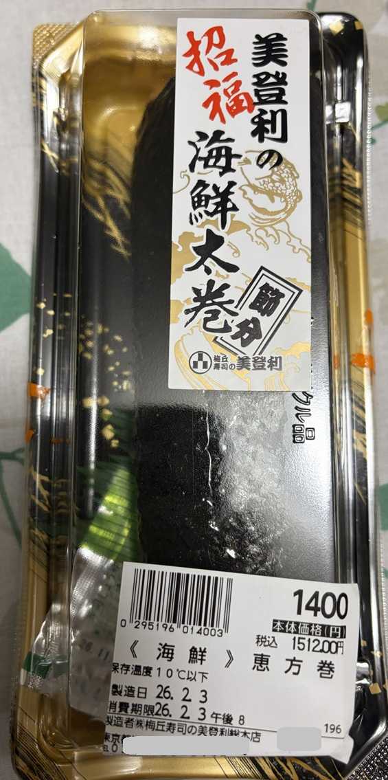 2月3日、節分の日。ツレが寿司の美登利の招福海鮮太巻を買ってきてくれました!1本あた…