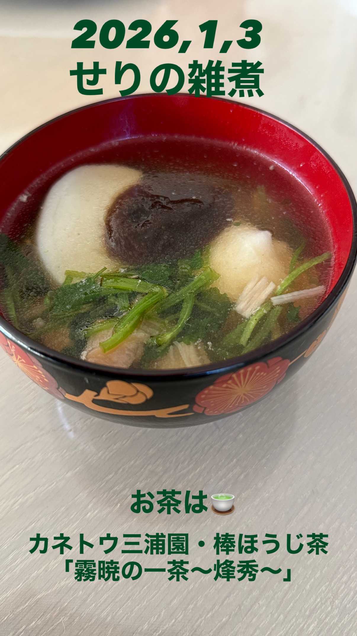 こんにちはhappybirthday!です。一杯のお茶に幸せを感じます。2日は雪が降りました天気が心配でしたが 晴れ午後 息子たちが久しぶりに帰宅しました。近所のイタリアンでランチ次男たちは1泊お泊まりします3日の朝は 夫とふたり三が日はお餅を食べよう地味にセリのお雑煮美味しかった!本日はこんな1日でした。最後まで読んでくださってありがとうございます。明日も変わらない朝がきますように ↓こちらに参加しています。よろしかったら私に顔にポチ!いただければ幸いです。↓にほんブログ村にほんブログ村にほんブログ村