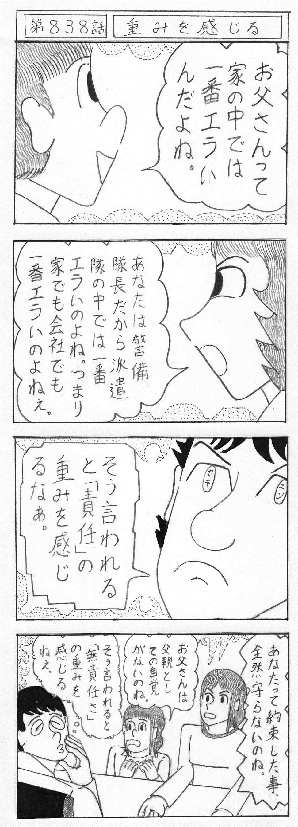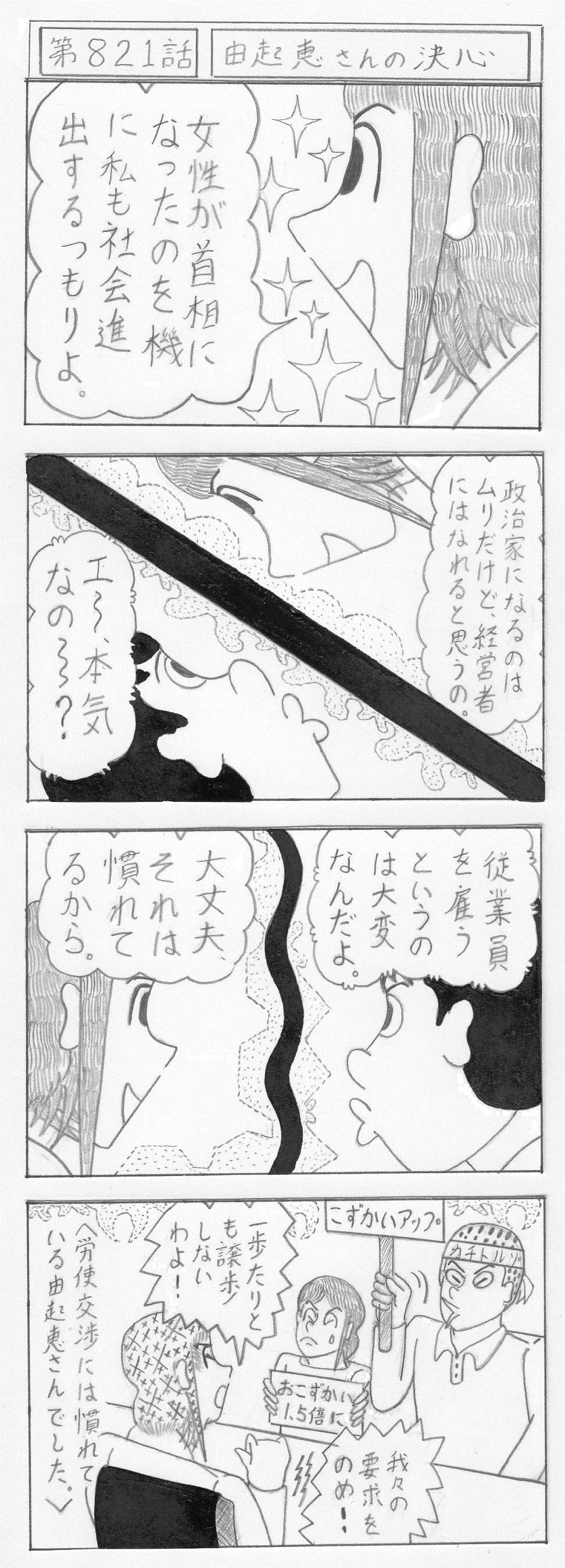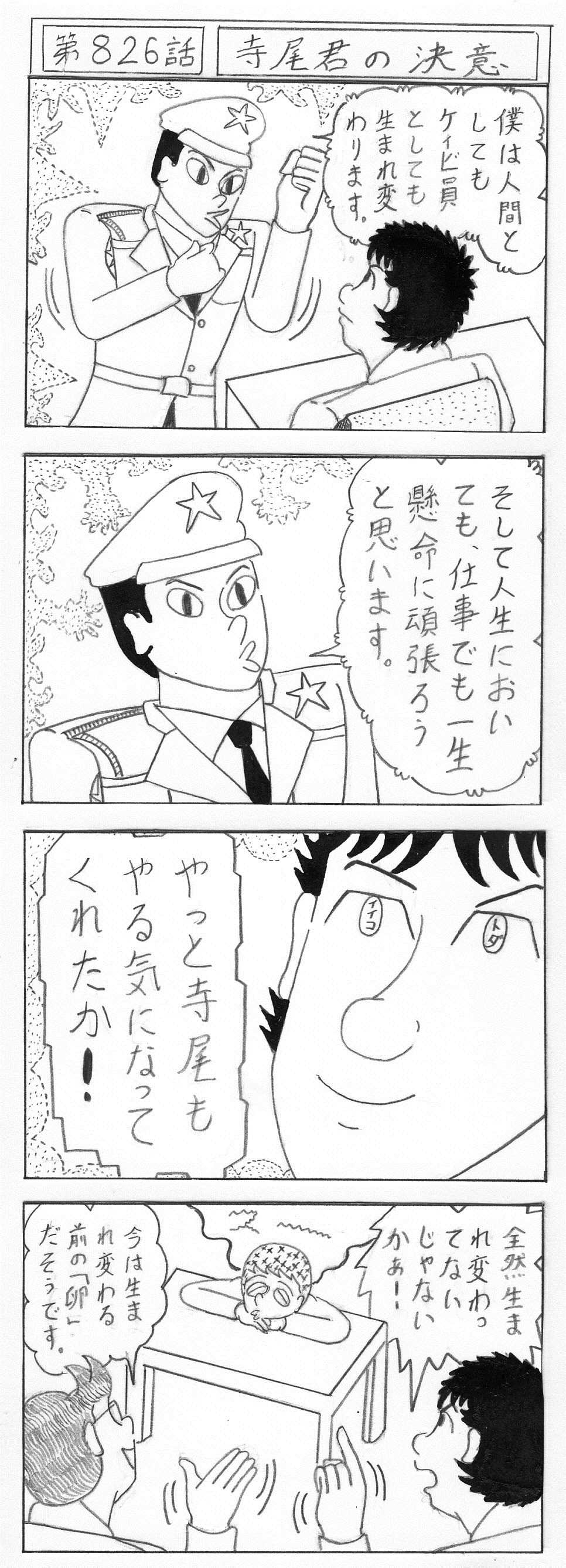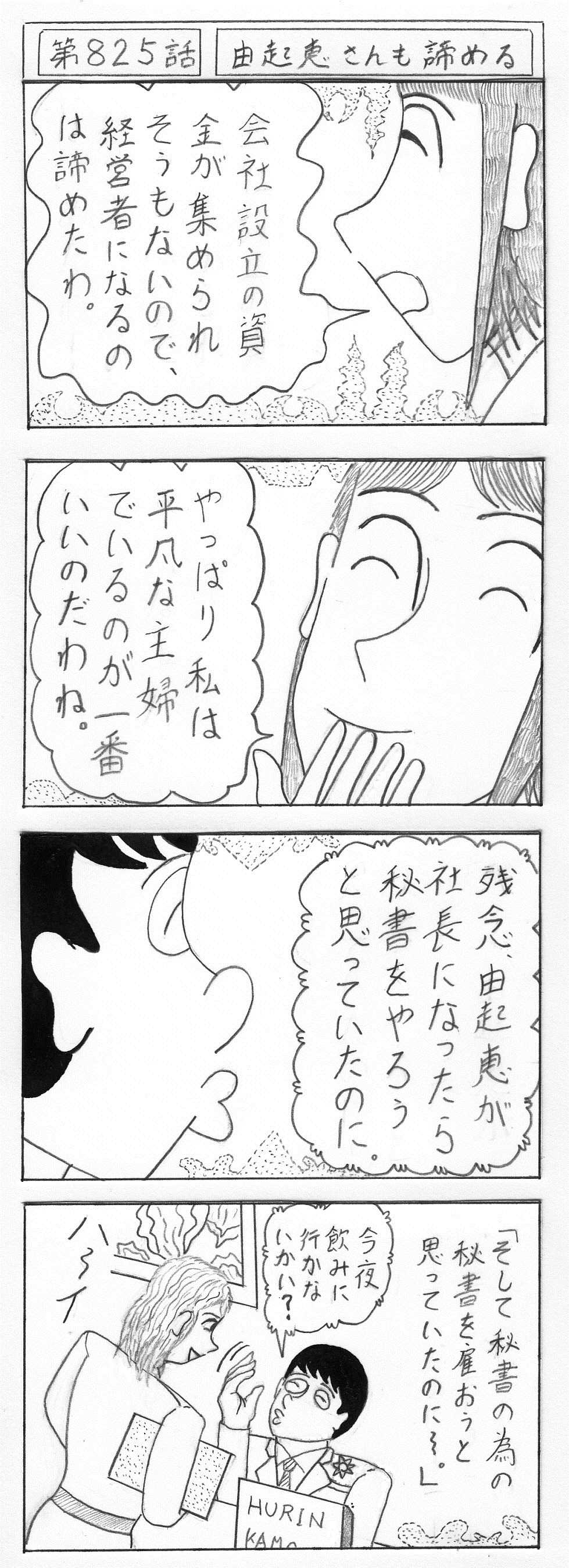 本日も「隊長と寺尾君」をご覧になって頂きまして、誠に有難うございます。 由起恵さんが経営者になるのを諦めたので、寺尾君のよこしまな考えは実行出来なく なりましたね。 でもこれで寺尾君一家には平穏な日常が戻る事でしょうね。 次回の更新日は12月24日(水)を予定しておりますので、よろしくお願い致します。
