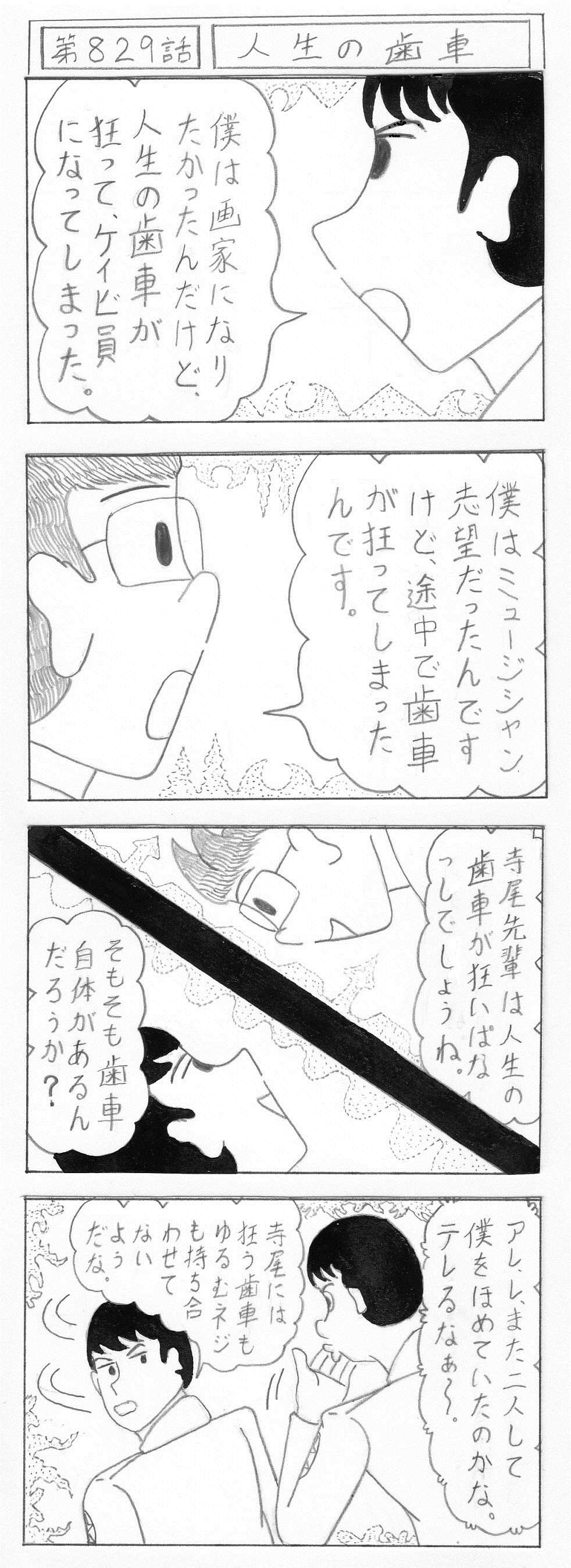 明けましておめでとうございます。 本年もよろしくお願い致します。 今年最初の「隊長と寺尾君」をご覧になって頂きまして、誠に有難うございます。 寺尾君はもともと歯車がないので、人生の歯車が狂うことはないのですね。 その代わり毎日の生活が狂いっ放しですけどね。 次回の更新日は1月7日(水)を予定しておりますので、よろしくお願い致します。