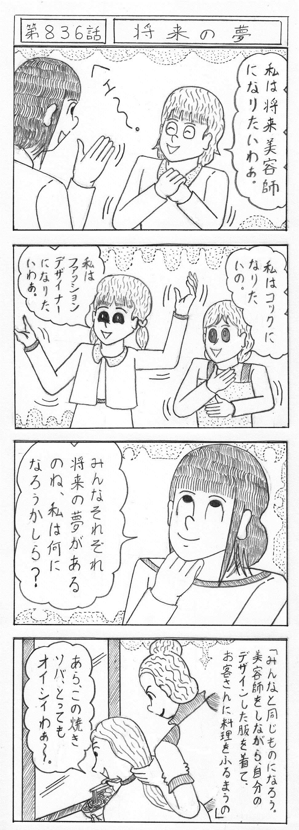 本日も「隊長と寺尾君」をご覧になって頂きまして、誠に有難うございます。 結局はかおるちゃんはどの夢も実現不可能とわかったのですね。 まだ時間はたっぷりありますから、あせらずじっくりと将来の夢を考えた方が いいでしょうね。 次回の更新日は1月26日(月)を予定しておりますので、よろしくお願い致します。