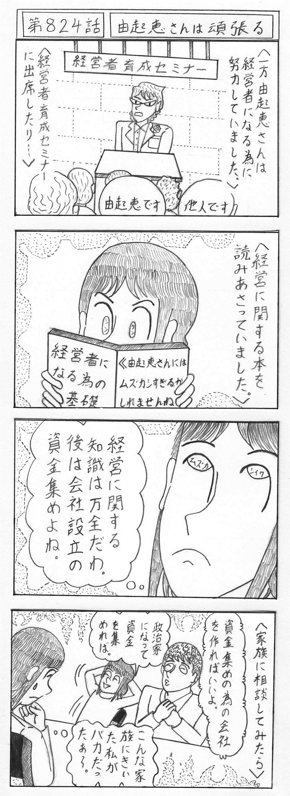 本日も「隊長と寺尾君」をご覧になって頂きまして、誠に有難うございます。 由起恵さんの場合、経営者になる為に自分の家族に相談したり応援を頼むのは 極力控えた方がいいでしょうね。 次回の更新日は12月22日(月)を予定しておりますので、よろしくお願い致します。