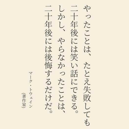 Yoshinobu KanemaruさんのFacebookで見つけた言葉です。転載させていただきます。20年後に後悔するかどうかはわかりませんが、ほろ苦い思い出にはなるでしょう。人生はわからないものですから、できればやりたいことはやってみた方がいいですね。これには同感です。でも、そうは思っていても傷ついてしまうのが人間ですが、せめて理性で「傷つくことはないんで」と思いましょう。
