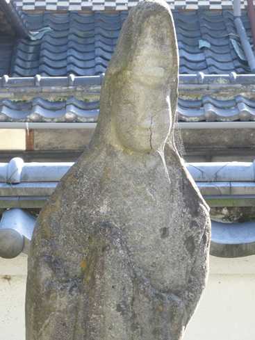 にほんブログ村 矢作橋近くの高見彰七作品、新発見の報告。現地確認での訂正箇所を反映した、リンク用まとめを掲載します。発見者は「FDG公式さん」です。【FDG公式さん】 「FDG公式さんのH.P.」観音像は特に発見が困難な場所にありました。矢作川沿いの小道、名鉄鉄橋近くに観音像はあります。少し小柄な観音像ですが、綺麗な造りです。高さ1m以下の小振りな観音像ですので、前後接合面での割れはありません。小振りな観音像では、前後側面のワレがない高見観音が多くなります。高さ1m付近を境に、高見観音の製作方法が異なるのかもしれません。像の後頭部付近では大きな骨材(砂利)が露出しています。モルタル像でこれほど粗く大きな骨材は通常は使いません。骨材が表面に露出して、繊細な細工を損なう恐れがあるためです。高見彰七作品では、像後部には粗い骨材を含むモルタルがしばしば使われます。これには粗い骨材を配合し、像の強度を高めようとした意図があったと思われます。「背面のモルタルに粗い骨材を配合している」今回の観音像にも、この高見彰七作品の特徴があります。観音像は台座から外れてしまっています。台座には「交通安全 南無阿弥陀仏」(推定)の文字があります。文字のある面が前面の様です。本来この観音像は、交通量の多い国道1号線(旧東海道)、矢作橋付近にあったと考えられます。移設時に、観音像は台座から外れたと思われます。隣には弘化2年と書かれた石柱があります。この弘化2年の石柱は、同じ矢作川支流、足助町ににある弘化2年の石柱との関連が推定されます。「足助町の弘化2年の道標」【画像出典】 「足助町 弘化2年の道標」この石柱や台座と観音像の間には、瓦片や小石が詰められています。また観音像は両者側に傾いています。石柱と台座は観音像転倒防止の支えとなっています。現地確認の結果、高見彰七作品と判断しました。リンク集登録させていただきます。【 リンク集2 (No.35) 観音菩薩像 】 ・所在地: 愛知県岡崎市矢作町 名鉄本線矢作川橋近傍 ・製作年月: 不明 ・作家銘: なし ・その他: 台座に「交通安全 南無阿弥陀仏」(一部地中埋没) ・寸法: 観音像 高さ65cm, 胸部幅25cm, 胸部厚22cm 台座 幅25cm, 奥行25cm 石柱 幅7寸, 奥行8寸, 地上露出高約30cm ・発見者: FDG公式さんこれで、高見彰七作品は117体確認済みとなりました。消失作品7体や検討中の作品1体もあります。自力では発見は困難な今回の新発見。引き続き情報をお待ちします。いつもながら、FDG(フィールド・ティスカバリー・ゲーム)の探索力には驚きます。「FDG公式」さん、新発見おめでとうございます。【 ホテルオークラ クリスマスケーキ 】 < ↓ ランキングクリックはこちらから > にほんブログ村