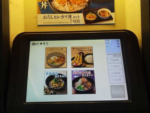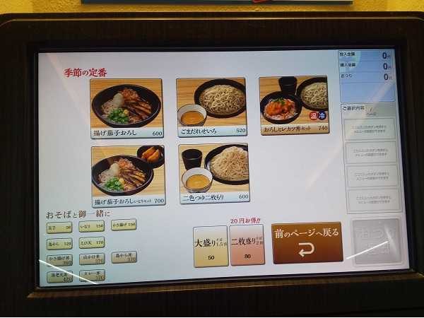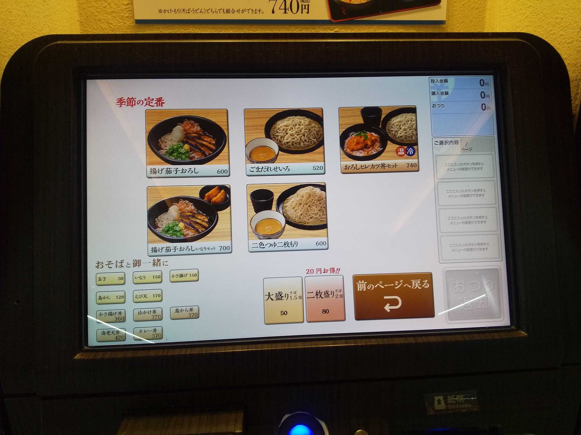 券売機の下の方に並んでいる「季節商品」「季節定番商品」の左側の「季節商品」は『冷し深川あさりそば深川』の専用ページだったので右をタッチし直す。