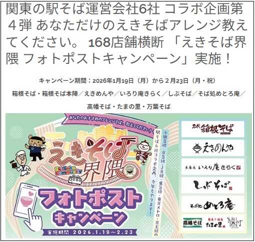 ” 関東の駅そば運営会社6社 コラボ企画第4弾 あなただけのえきそばアレンジ教えてください。 168店舗横断 「えきそば界隈 フォトポストキャンペーン」” というのが開催中( お知らせ