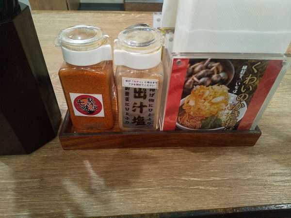 途中で「出汁塩」「駅そばに合う七味」をかけて味変を楽しむ