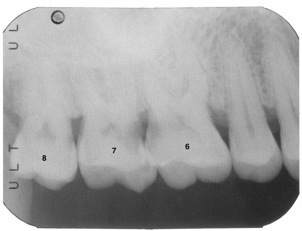 40代女性、右下7、遠心カリエス痛みは無いとか。歯髄も死んでいるのやらいないのやら。親知らずが水平に寝っ転がっているとよくあるケースだ。通常は治療不能で親知らずと一緒に抜歯になる。こういう場合3MIX+α-TCP+CR:ダイレクトボンディングがないと保存治療は不可能だと思う。歯髄症状が出た時はまた3MIX+α-TCPで根管治療(歯髄再生治療)をするが、その時に親知らずは抜歯する予定。では時系列でどうぞレントゲン写真では7番の遠心半は失われている。我慢強い方で、あちこち沁みていたので、この歯が痛かったことは記憶にないそうだ。普通に痛かったと思うのだが。3MIX+α-TCPCR:ダイレクトボンディングシステムで充填していく。後ろの親知らずを抜歯する時点で7番の遠心の形態はもう少し綺麗に仕上げるつもり。