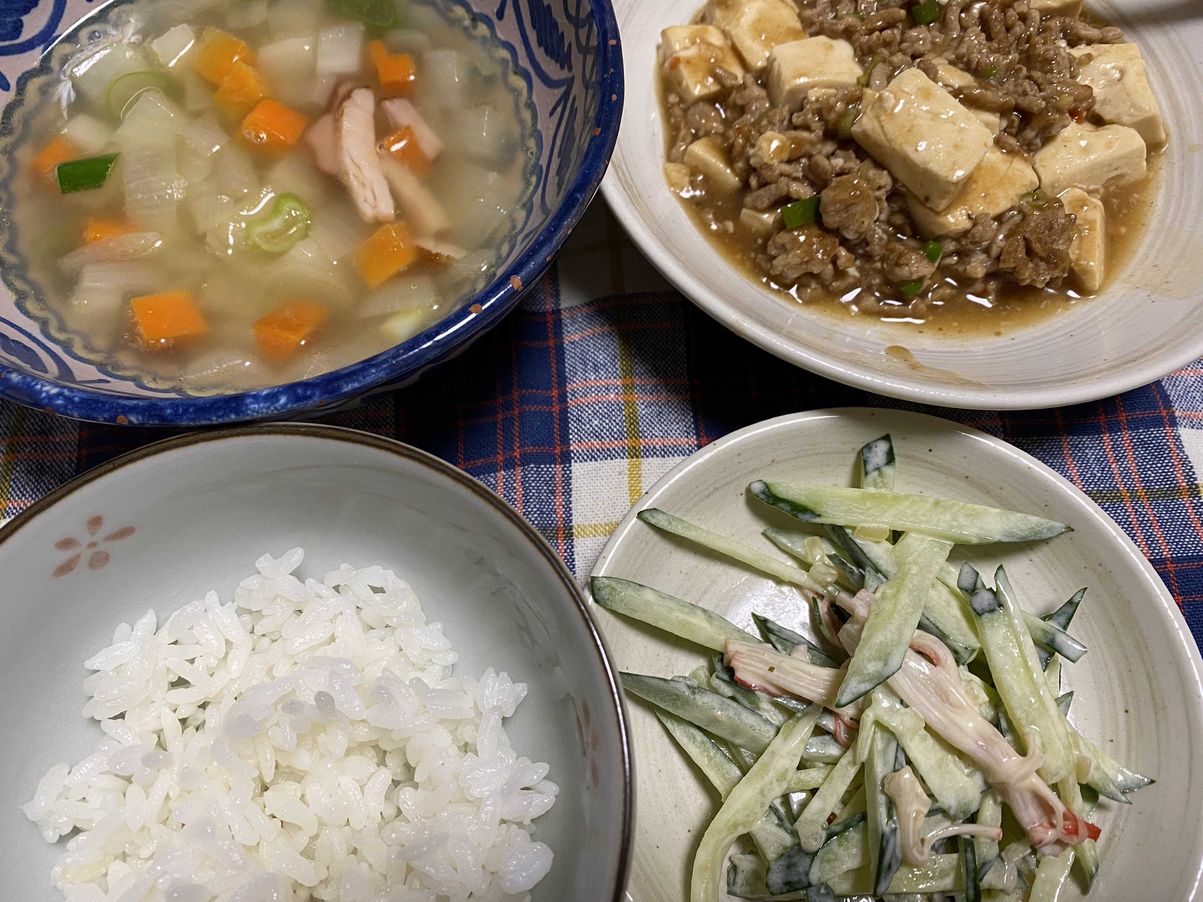 麻婆豆腐、胡瓜とカニカマサラダ、大根スープ。私の麻婆豆腐が美味しくて(笑)、また作りました。生協で豆腐が登録してあり、毎週届くので、余りがち。豆腐の消費法として、よく作ります。辛いのは、全然ダメなので、豆板醤はほんの少々。そこへ豆豉、甜麺醤が入り、ホント美味しい。調味料って、素晴らしいですよね。今日の新作は、大根スープ。小さく切った大根、人参、玉葱、ベーコンを、バターで炒め、柔らかくなるまでコトコト煮込み、チキンブイヨン、塩、胡椒で味つけ。本に載っていたのですが、大根とバター?合うかなと、組み合わせが新鮮で、試してみました。とても美味しかったです。トマトを入れたくなるけれど、それじゃ、ミネストローネになってしまいますね。Sさんから、昨日は、楽しかった!とお礼の電話。こちらこそ、心から。気が合う人たちとのおしゃべりって、元気出るね。次回は、月末に、「ノラジジ」を予約済み。「エスカフェ」も、10月のマスターのライブに参加して以来なので、二月には行こうか、と話す。なかなか予定が合わず、二月になるけれど、場所が赤城第二南面道路沿いなので、雪が心配。降ればキャンセルしかありませんが。遊ぶ話ばかりですが、予定があるのは楽しいです。 花ブログランキングに参加しています。 応援のクリックをよろしくお願いします。 昨日のアクセス数 1535 昨日のランキング順 4 位