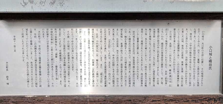 おはようございます毎日の生活では 春は先と 思いましても自然は正確に 動いていますね 菜の花が咲き誇っている 写真も 送られてきています小口城跡 & 小口神社を アップ致します小口城跡 説明小口城跡 櫓が作られていました 訪れた日は 非公開でした小口城跡 堀が浅いですが 作られていました小口城跡 立派な塀 銃口が作られていました小口城跡 城跡の堀の近くに 建立小口城跡 堀を渡る 橋小口城跡 城門をアップで小口城跡 塀の裏側小口城跡 記念石塔 ありました小口城跡 回廊 この城は長禄3年(1459年)織田遠江守近松によって 築城永禄年間(1558年~1569年)信長の軍勢に攻略され 廃城小口城跡 資料館小口城跡 採掘報告小口神社 石柱 小口城の 守り神 小口神社 鳥居小口神社 灯篭小口神社 寄付札小口神社 百度石小口神社 拝殿小口神社 手水舎小口神社 説明小口神社 山柿 小口神社 本殿小口神社 本殿内部