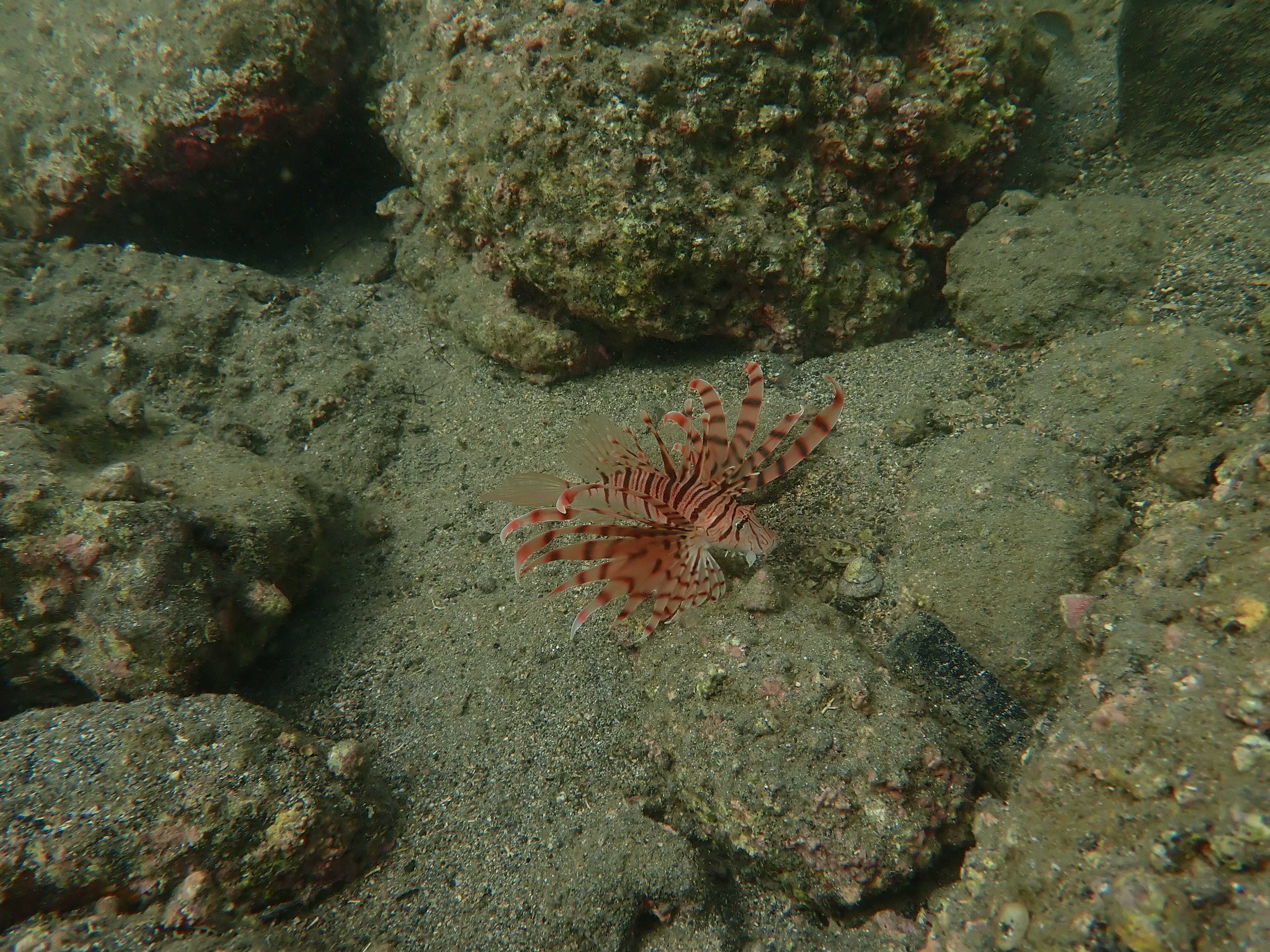 近付いてる途中で察したが、これはノーマルのミノカサゴだ。今まではハナミノカサゴしか見たことがなく、無印ミノカサゴは初遭遇。やはり勢いよく逃げず、ヒレを広げて緩やかに泳ぐ。