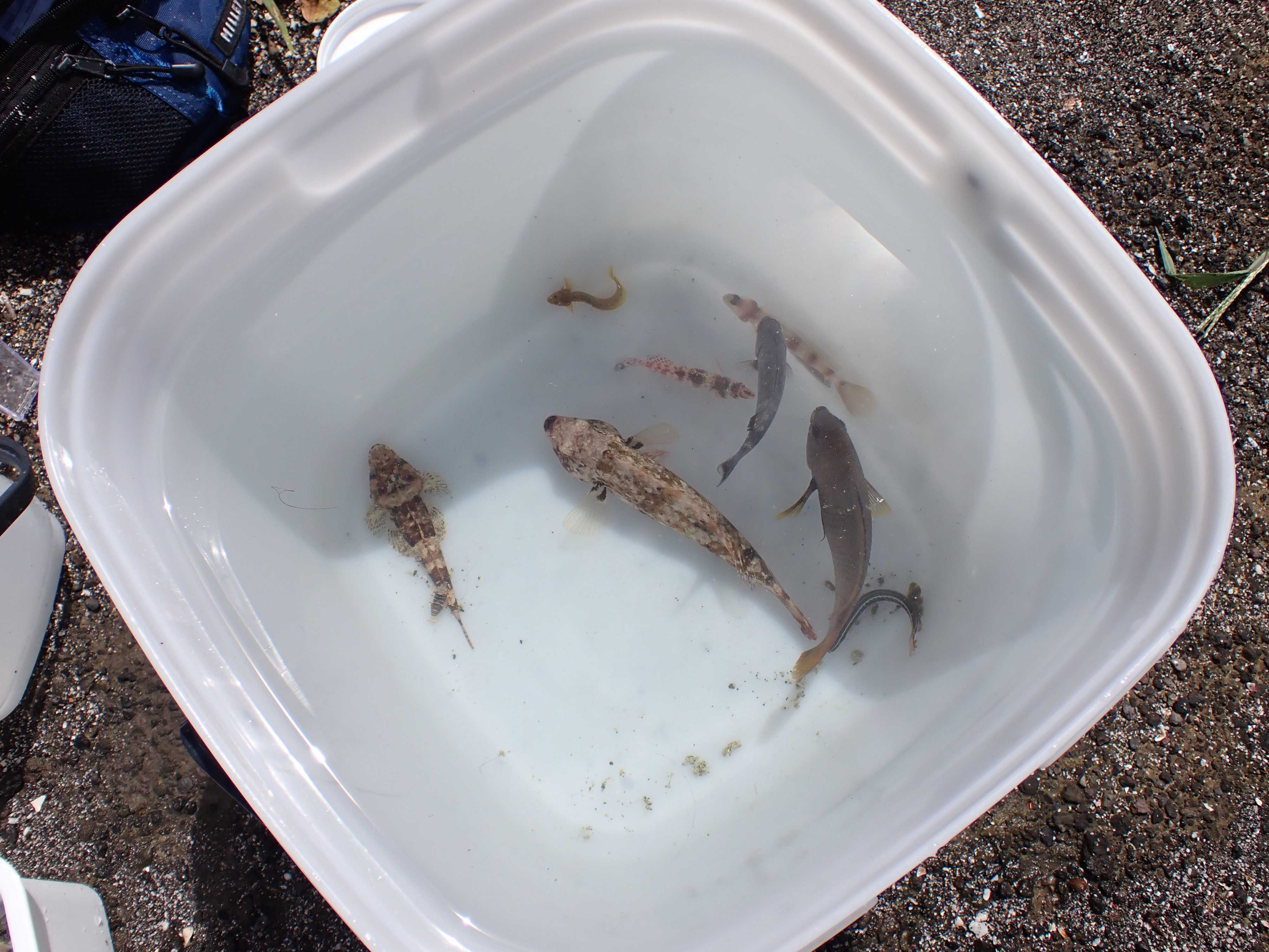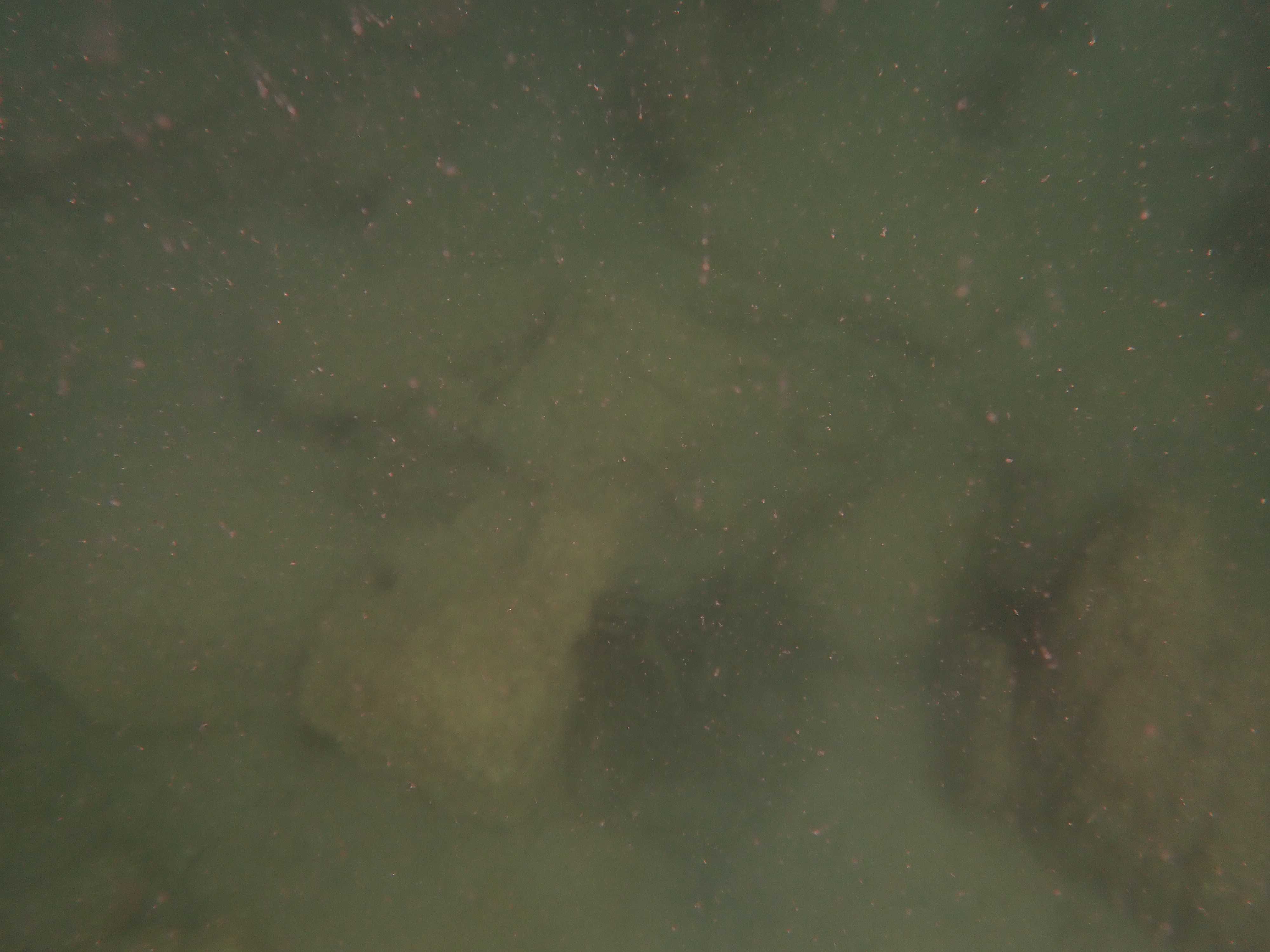 遠浅に見えて入るとすぐに深くなる。初見殺しやなこれは…。中央は砂地に混じって大きめの転石がぽつぽつ、左右は岩棚といった環境で、この日のコンディションだろうが濁りが多めだ。