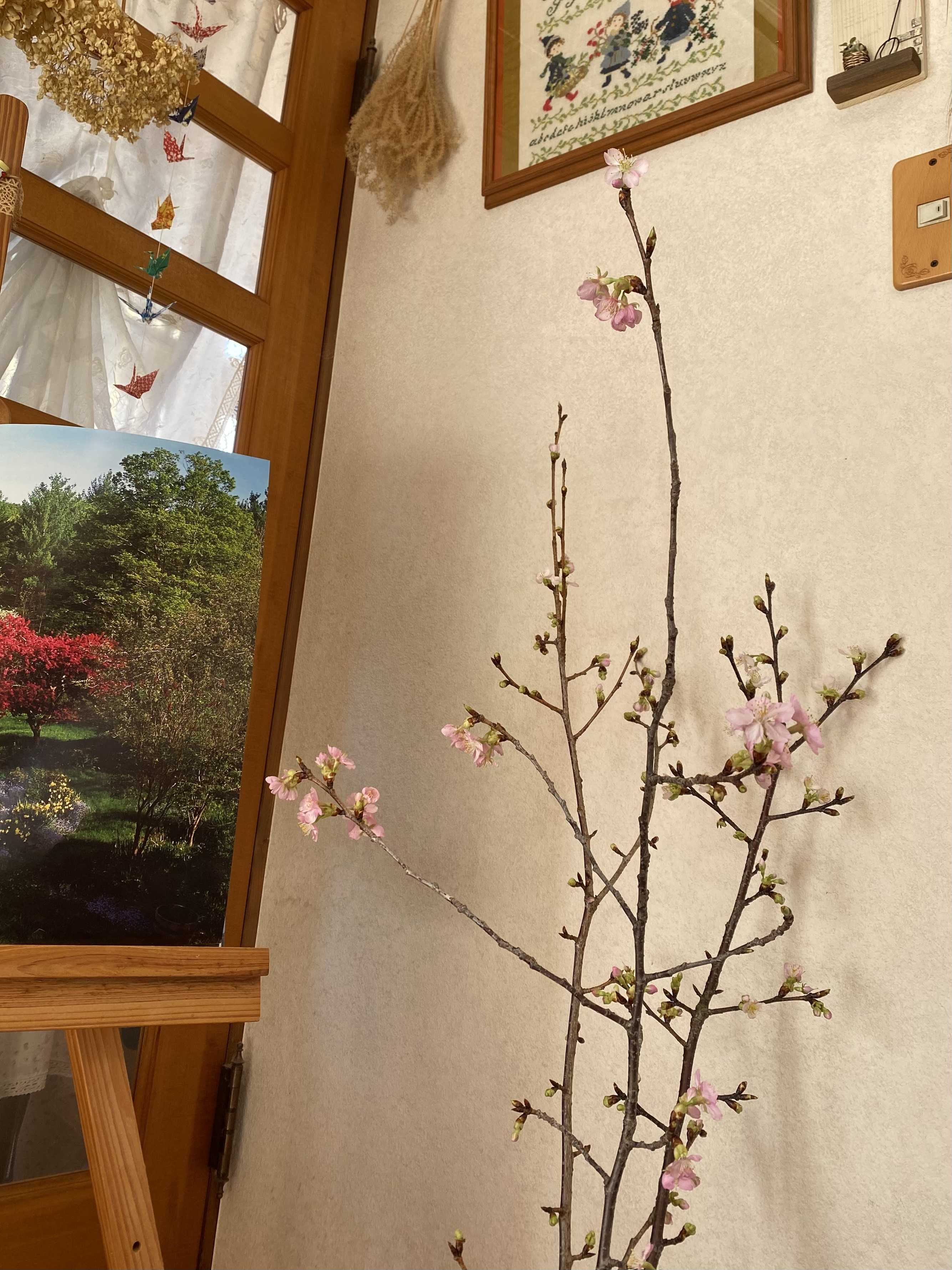 花瓶の桜が七分咲き。ジョウビタキ