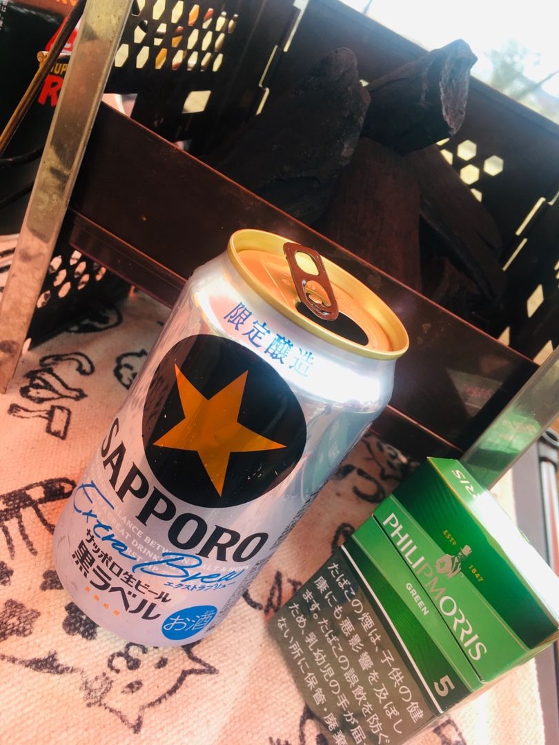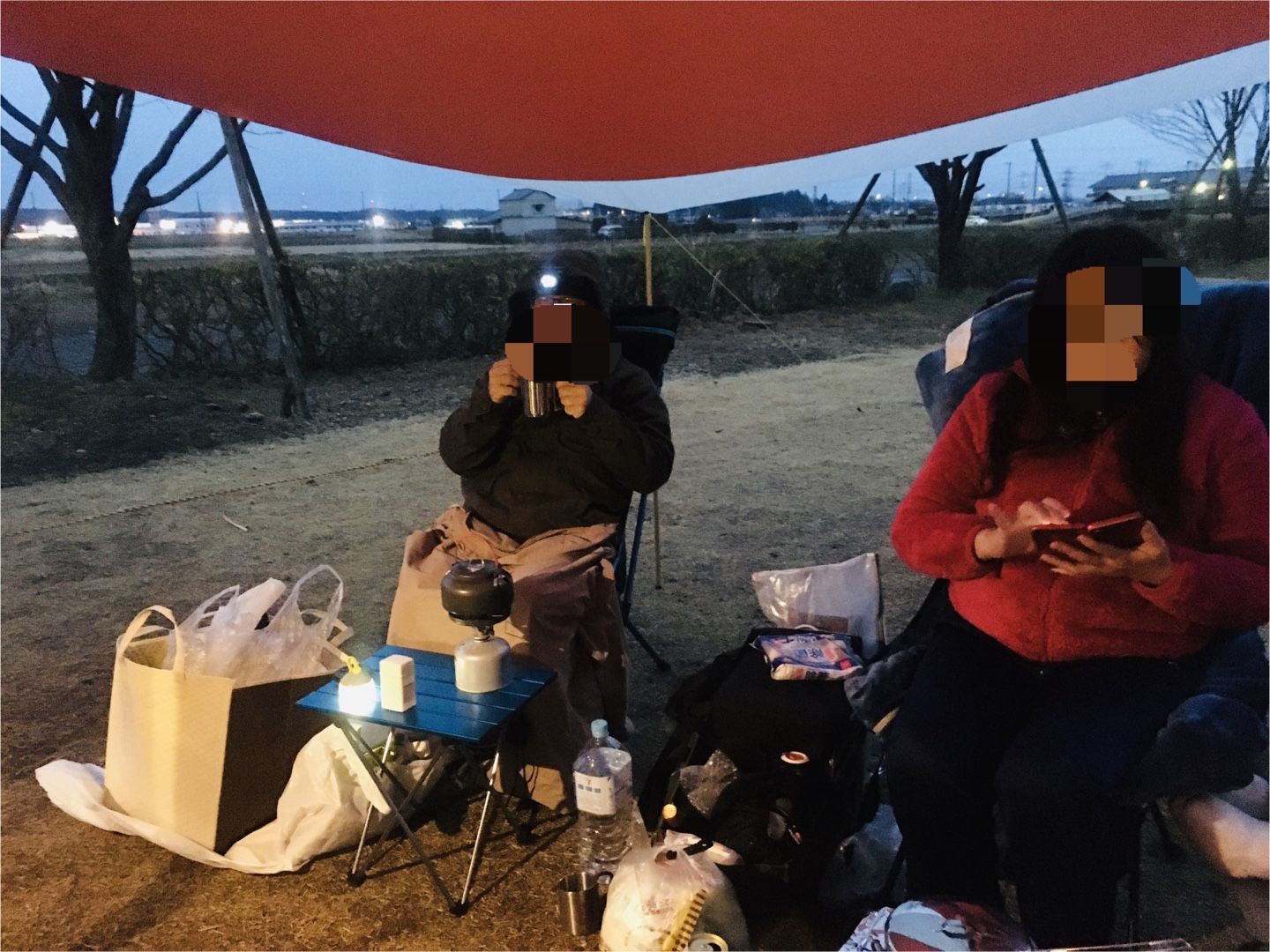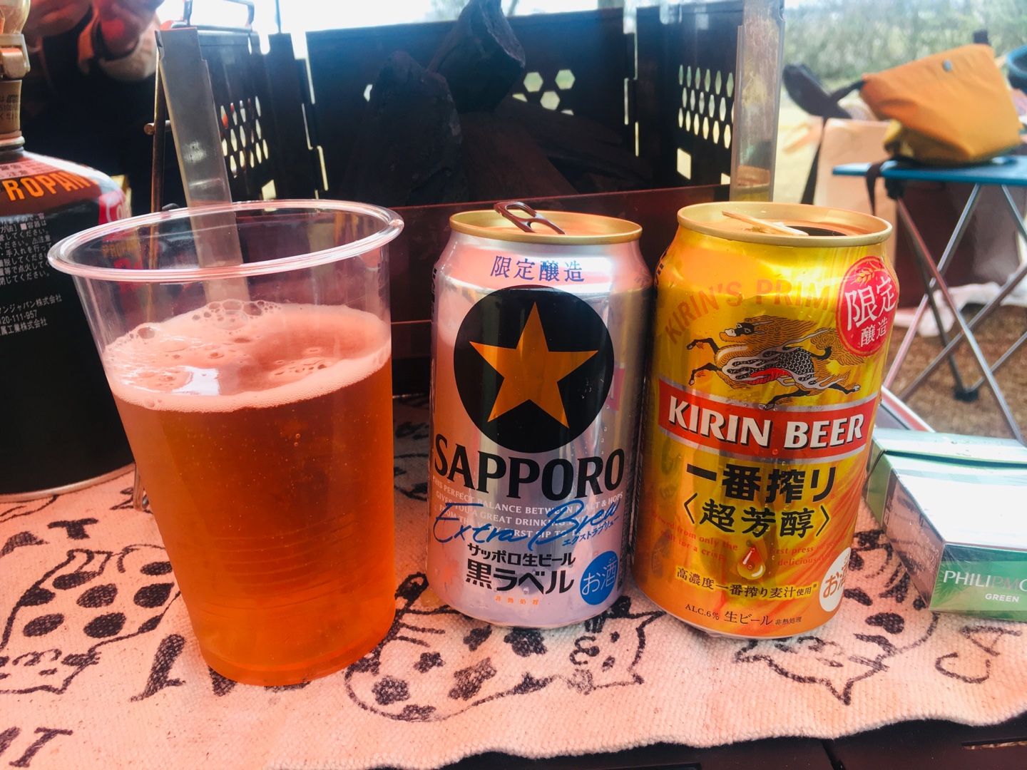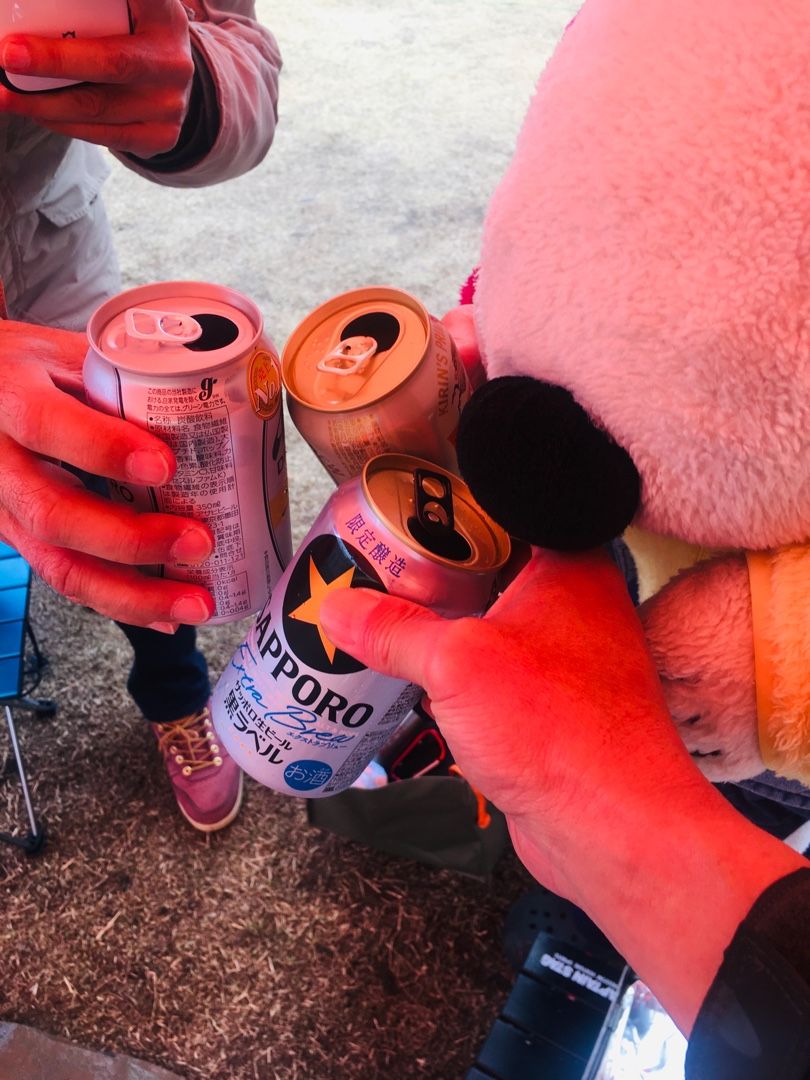 テント設置完了!友人が寝床セッティングの最中 待ちきれずにお先に乾杯🍻
