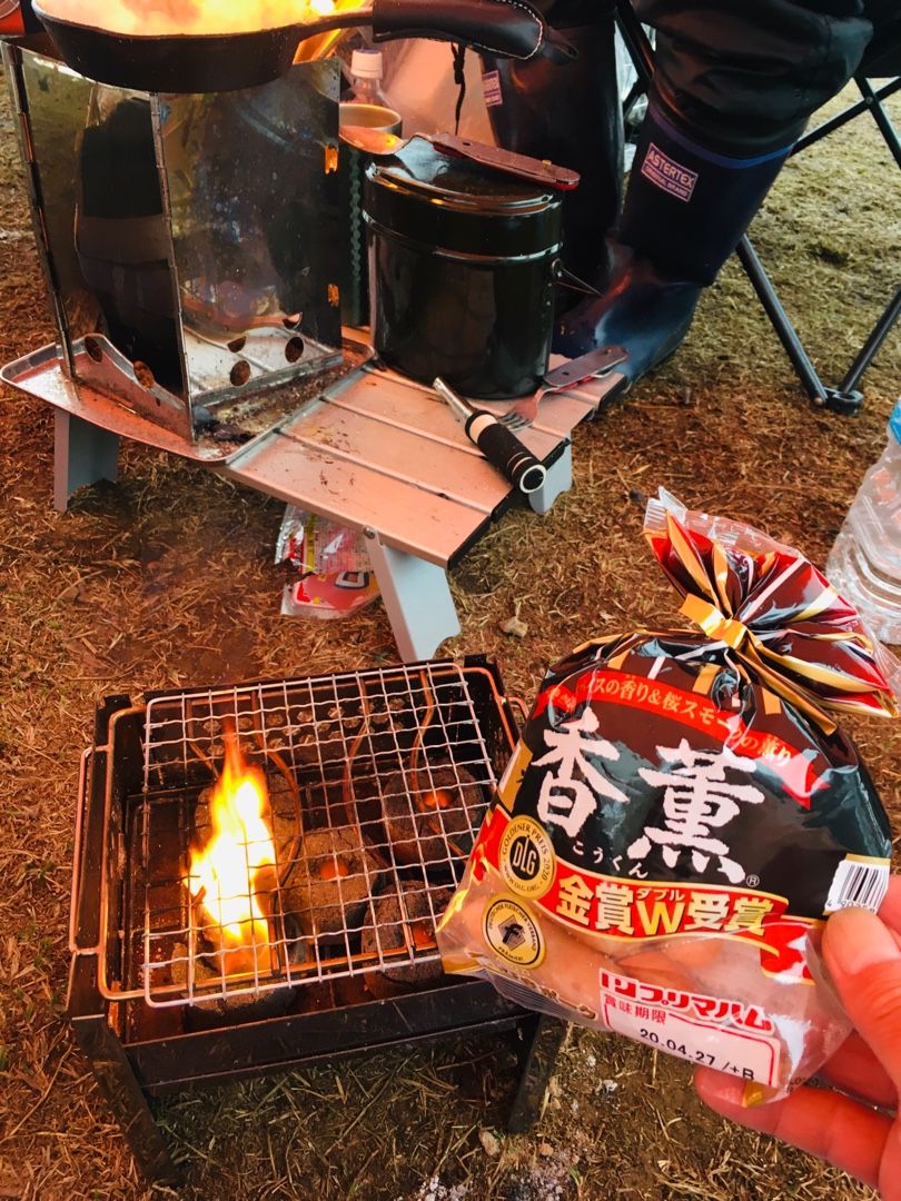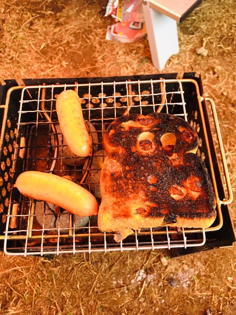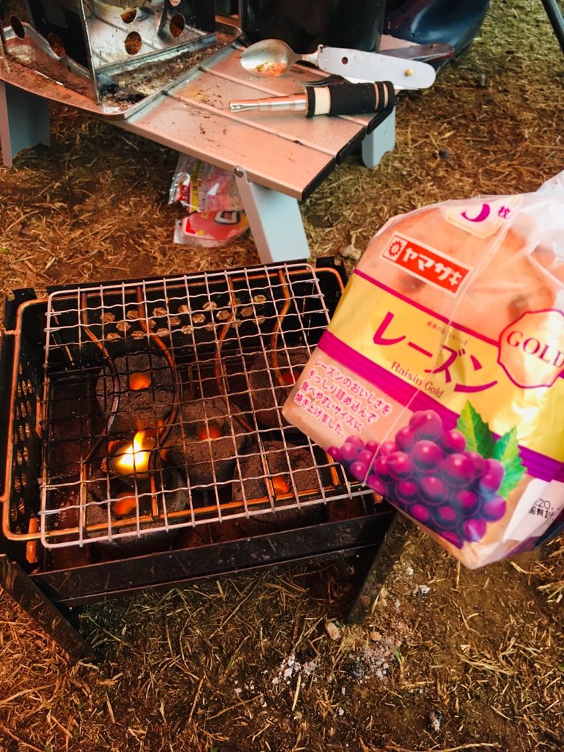でも雪中キャンプ中々楽しいです👍寒い🥶けど 雪景色見ながら朝食作り。レーズンパンとソーセージを炭火焼き