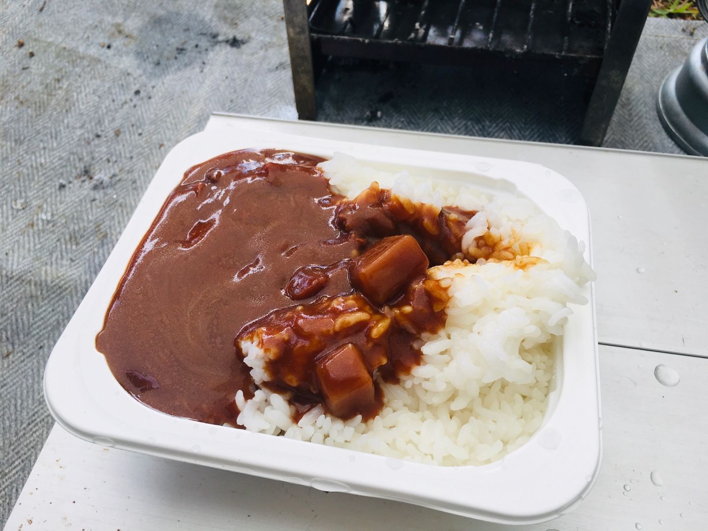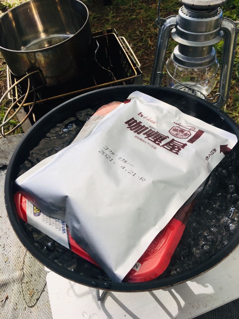 今日の朝食はカレーです。ご飯もカレーもレトルトだけど💦レトルトも外で食べると何故か美味い😋