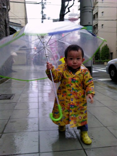 いっちょまえにお兄さんの傘さしてお兄さんのようちえんお迎えに向かう。 1歳10…