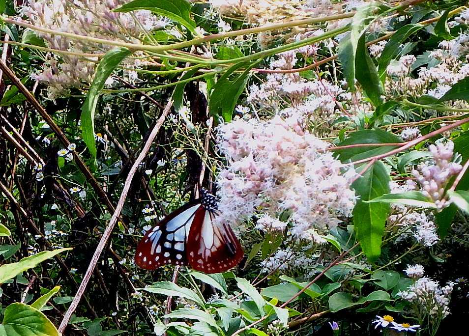 アサギマダラ、ヨメナ、空色朝顔、釣船草、筑紫萩(半田山植物園)