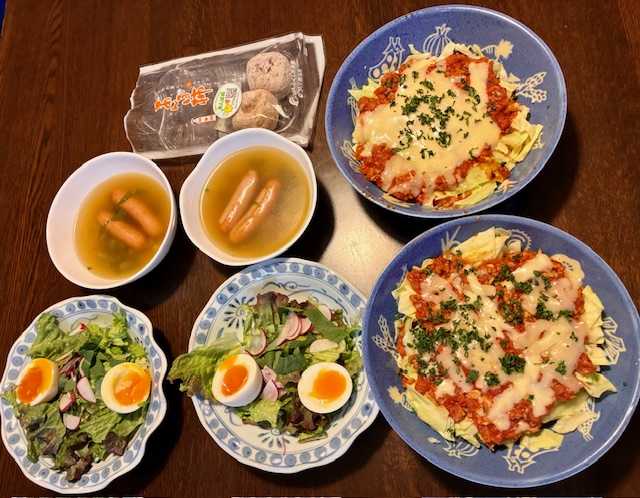 夕食は、春キャベツのラザニア(春キャベツ・人参・玉ねぎ・大蒜・豚…