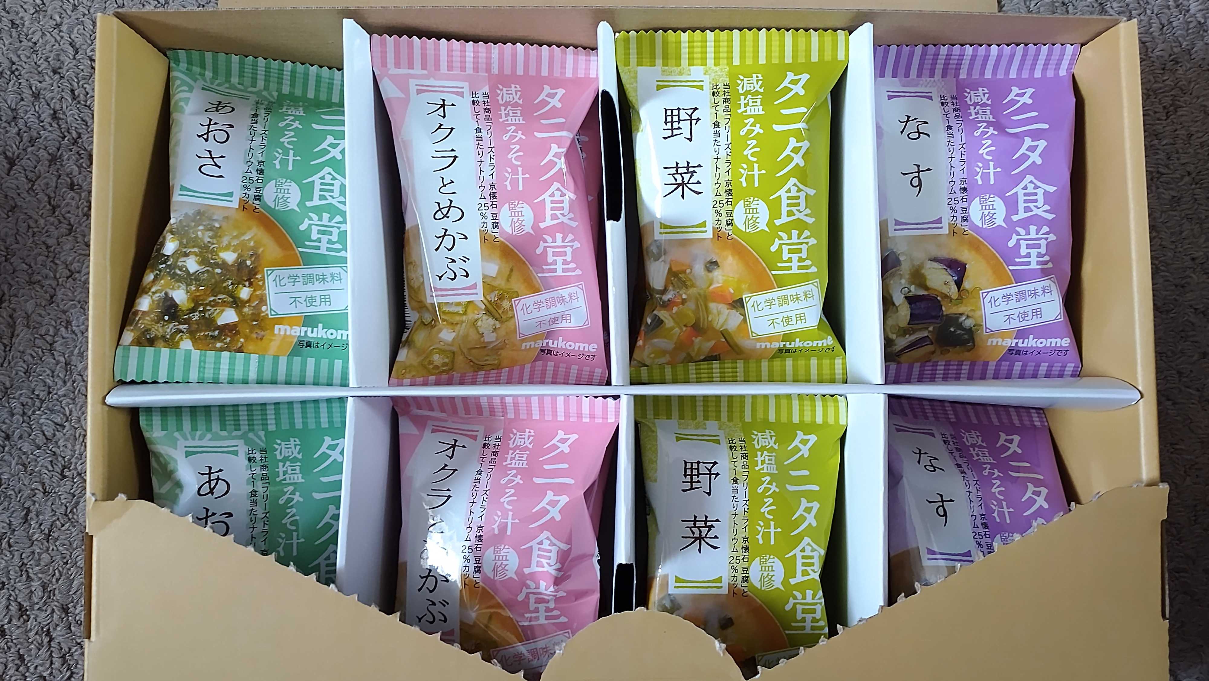 こちらはフリーズドライタイプの減塩味噌汁です。お湯を注ぐだけで味噌汁が完成しますので、不精な我が家にはピッタリです。オクラとめかぶ、あおさ、やさい、なすの4種類が入っています。減塩ですが皆とても美味しいです。個人的には、揚げナスの美味しさが好きです。