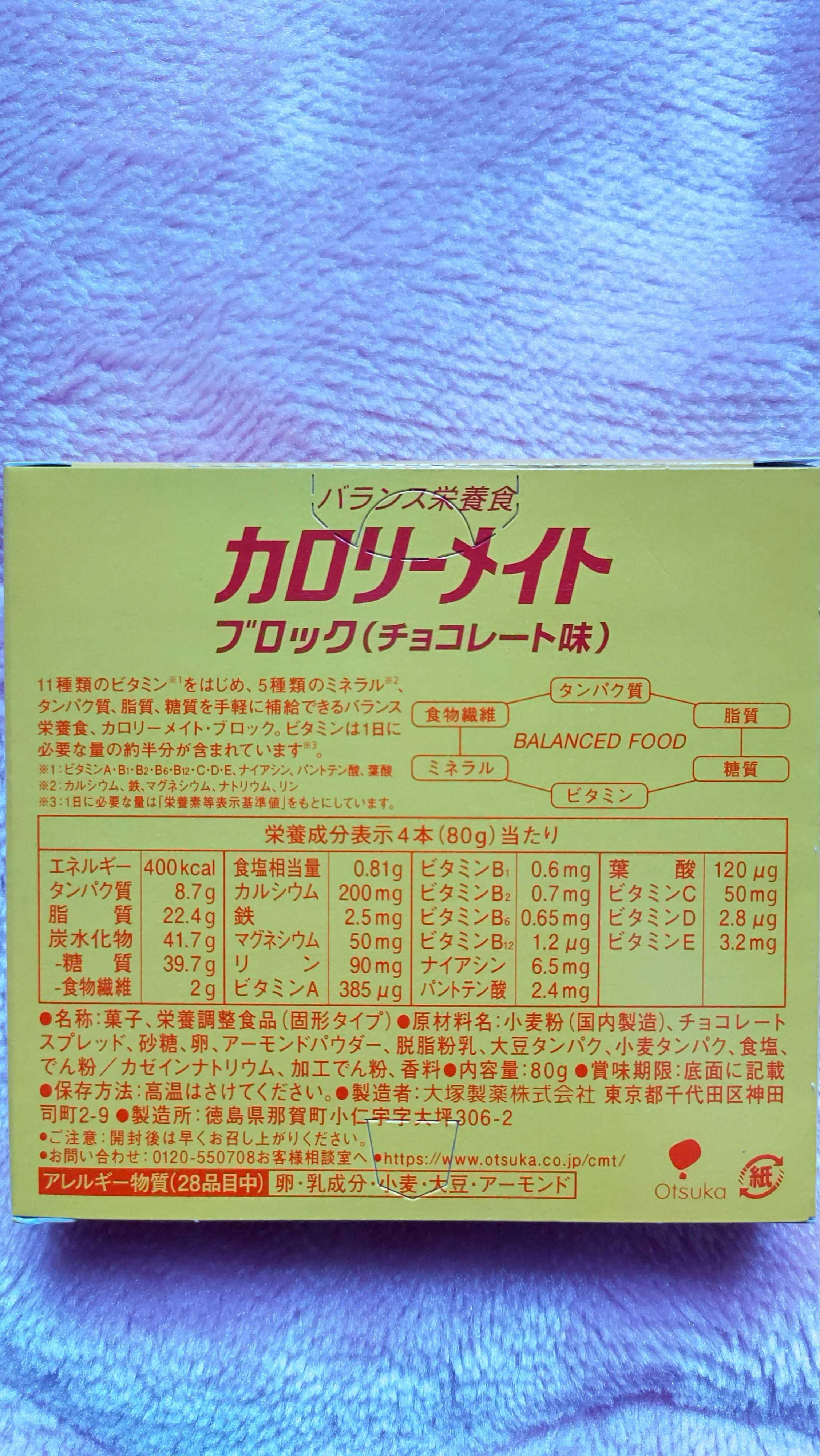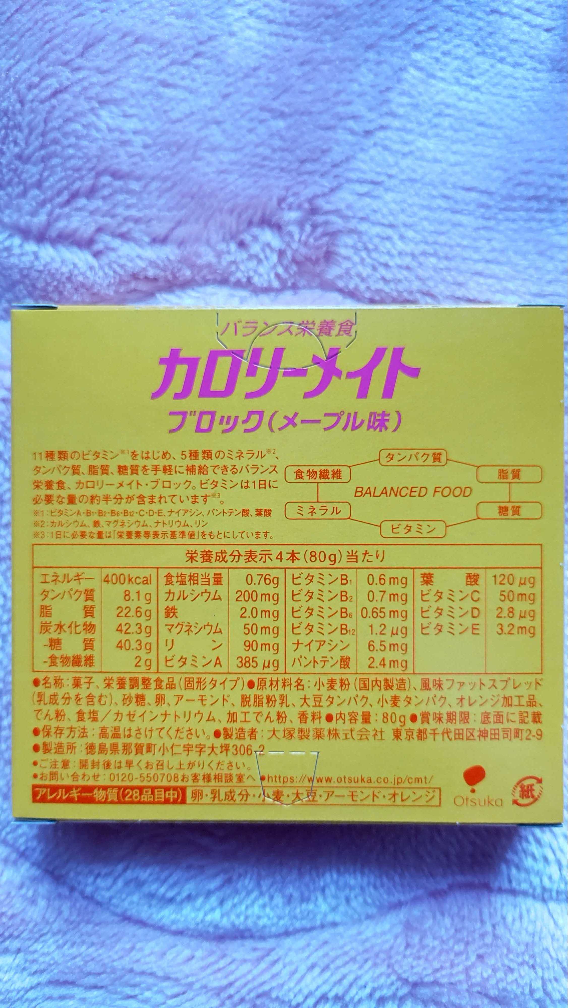 カロリーメイトは栄養分はほぼ同様です。1箱4本入りで400kcalあります。これはメープル味なので、甘めな香りと味が特徴です。コーヒーによく合います。簡単に栄養補給が取れるので助かっています。