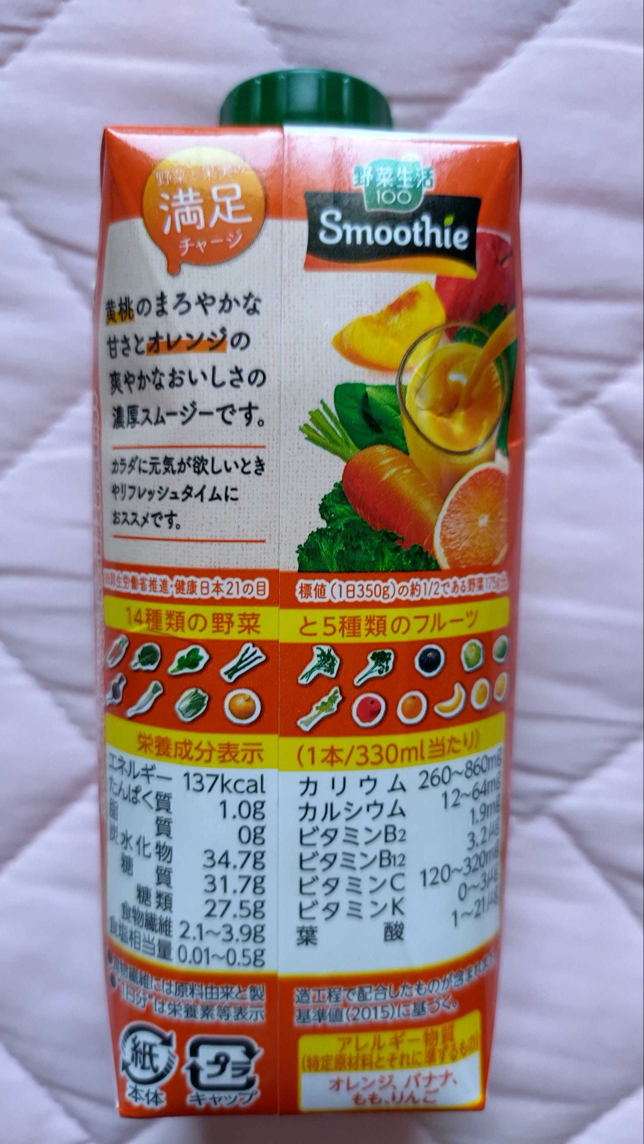 グリーンスムージー133kcal(330ml)17種類の野菜と5種類のフルーツで、キウイ味がメインです。適度な酸味でとろみがあります。ビタミンスムージー137kcal(330ml)14種類の野菜と5種類のフルーツ、オレンジ味がメインでです。酸味はそれほど強くなく、こちらもとろみがあります。それぞれ食物繊維が1日(350g)の1/2の野菜を使っており、野菜汁51%、果汁48%、食物繊維1%で構成されています。