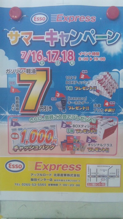 Express飯田インターSSは7/16・17.18夏のサマーキャンペーンを開催、当日はガソリン・軽油が看板価格から7円引き、10ℓ以上給油でBOXティッシュのプレゼント他シナジーCご入会で1000円キャッシュバック。